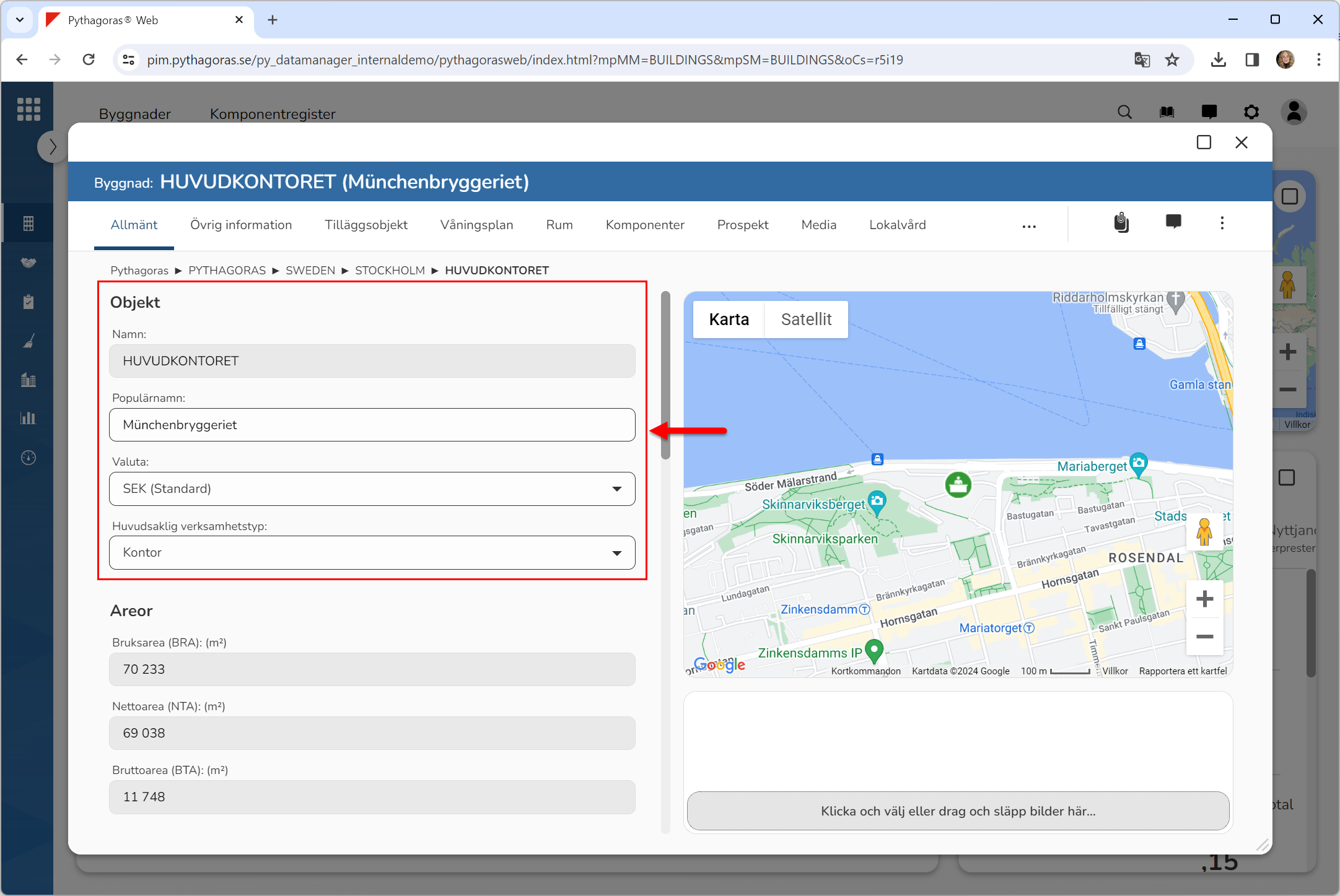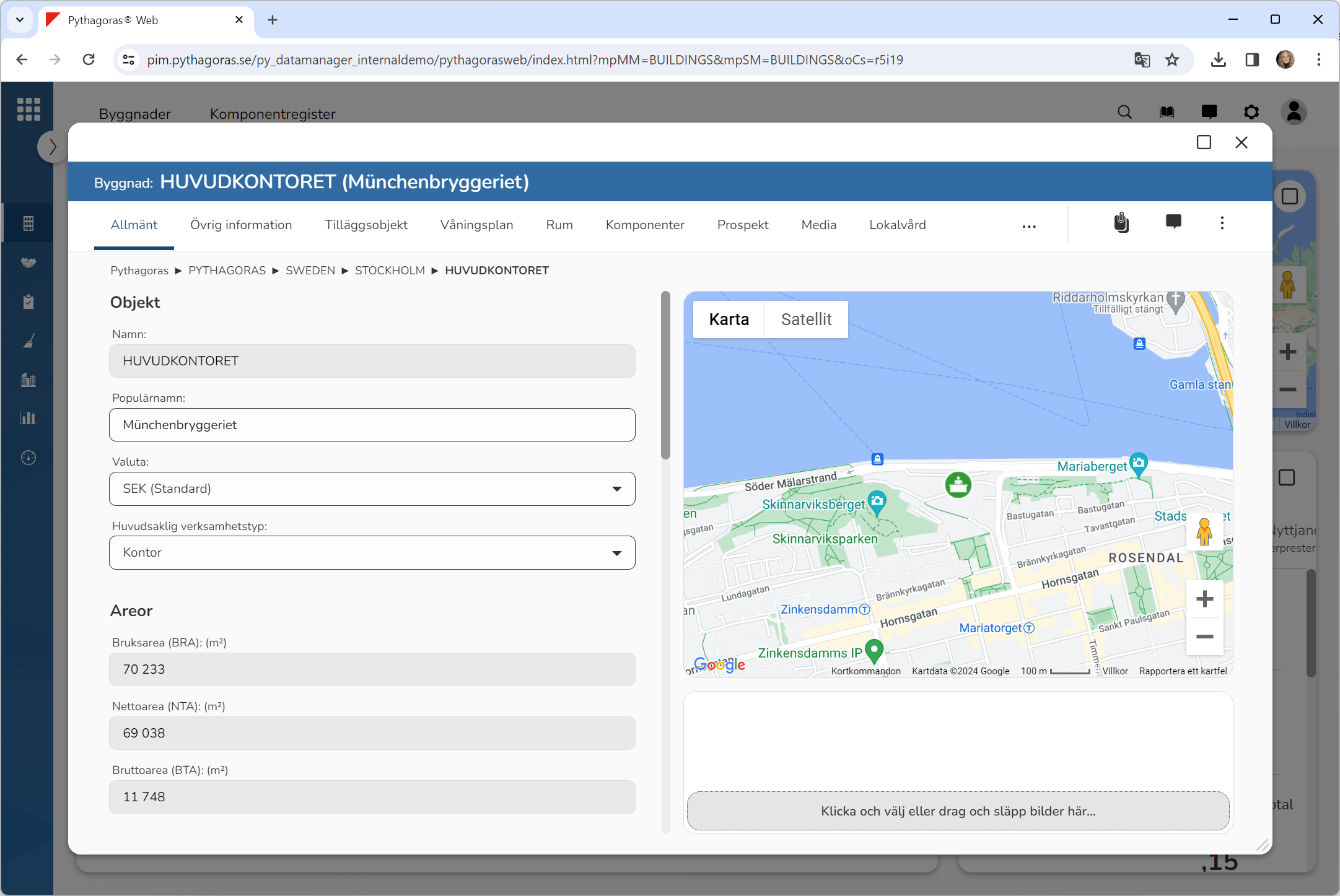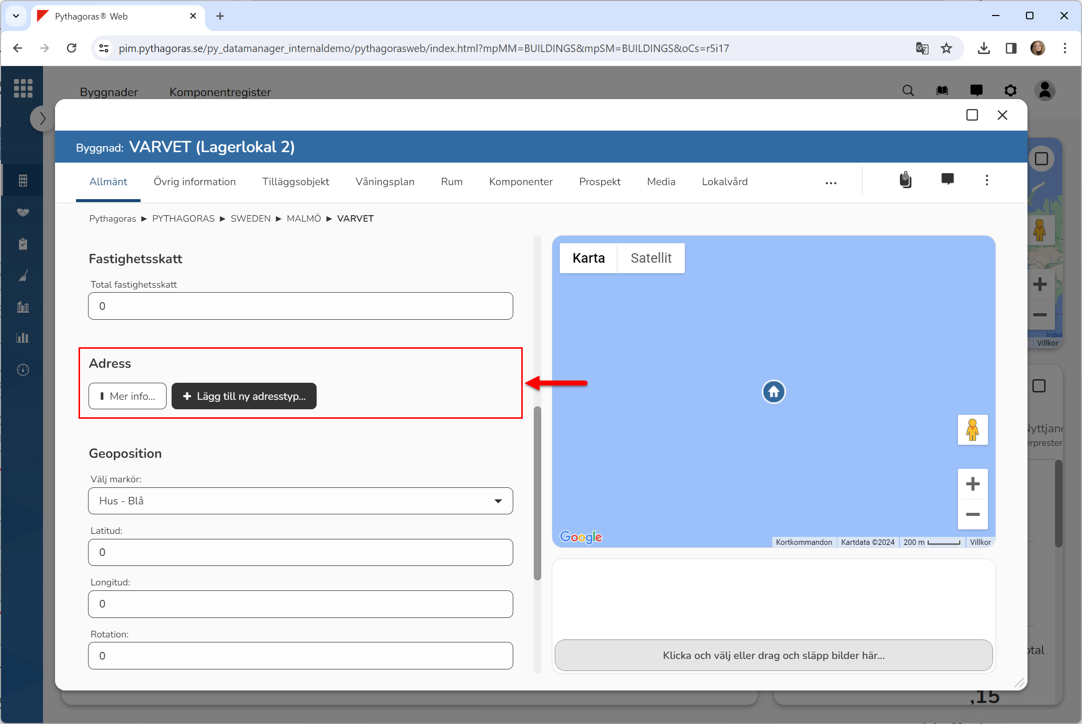 Notera att du kan lägga till, ladda ner och ta bort bilder från byggnadskortet (se bilden nedan).