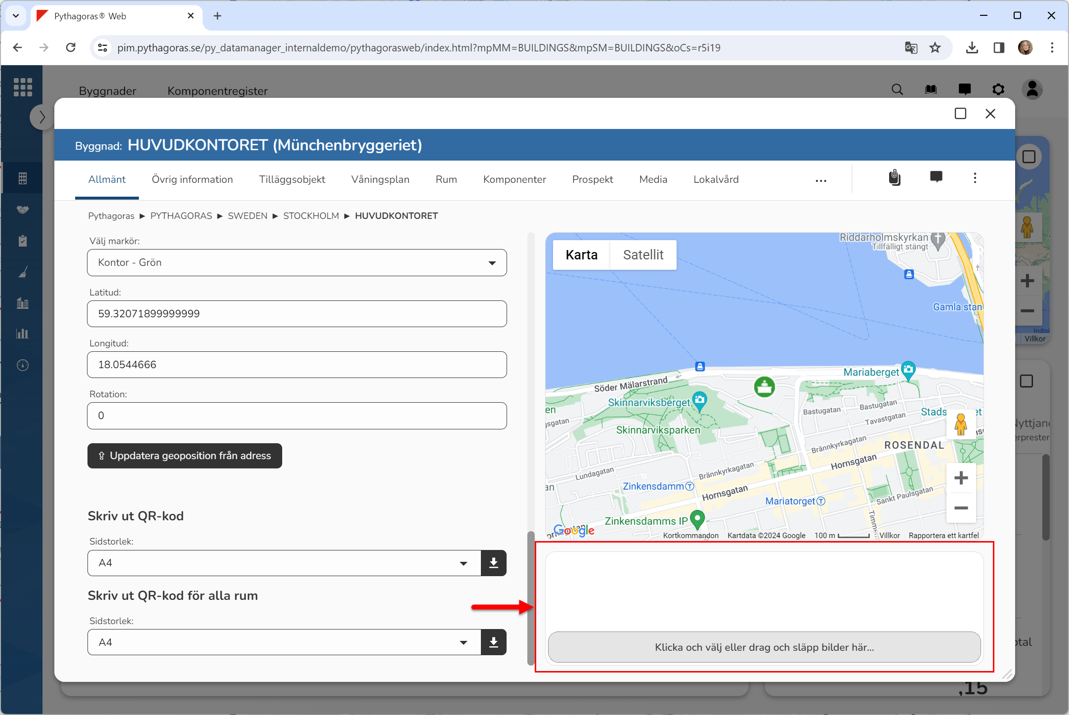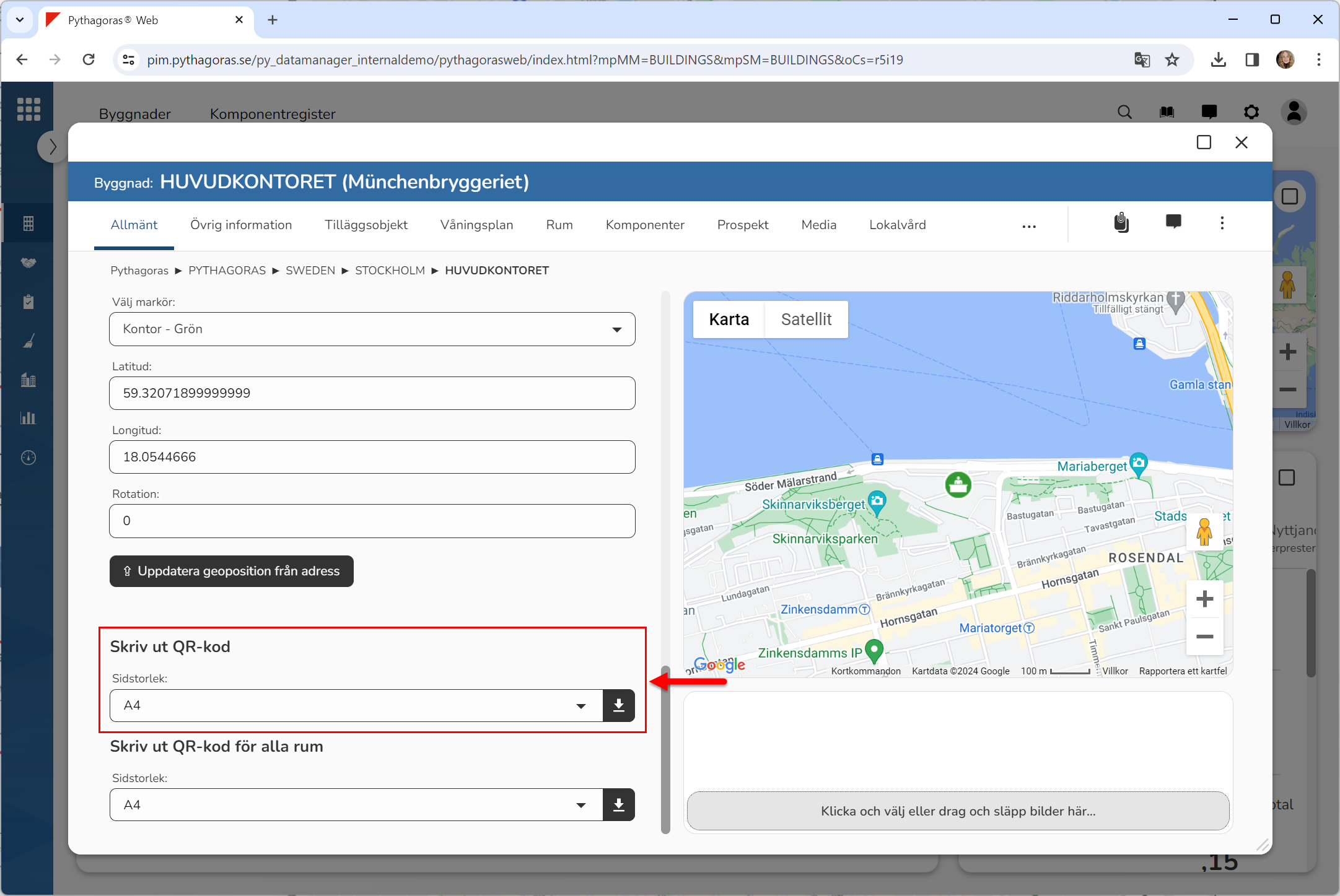 Om du skrollar i den vänstra delen av byggnadskortet ser du att den allmänna byggnadsinformationen är indelad i sju kategorier: "Objekt", "Areor", "Fastighetsskatt", "Adress", "Geoposition", "Skriv ut QR-kod" och "Skriv ut QR-kod för alla rum".