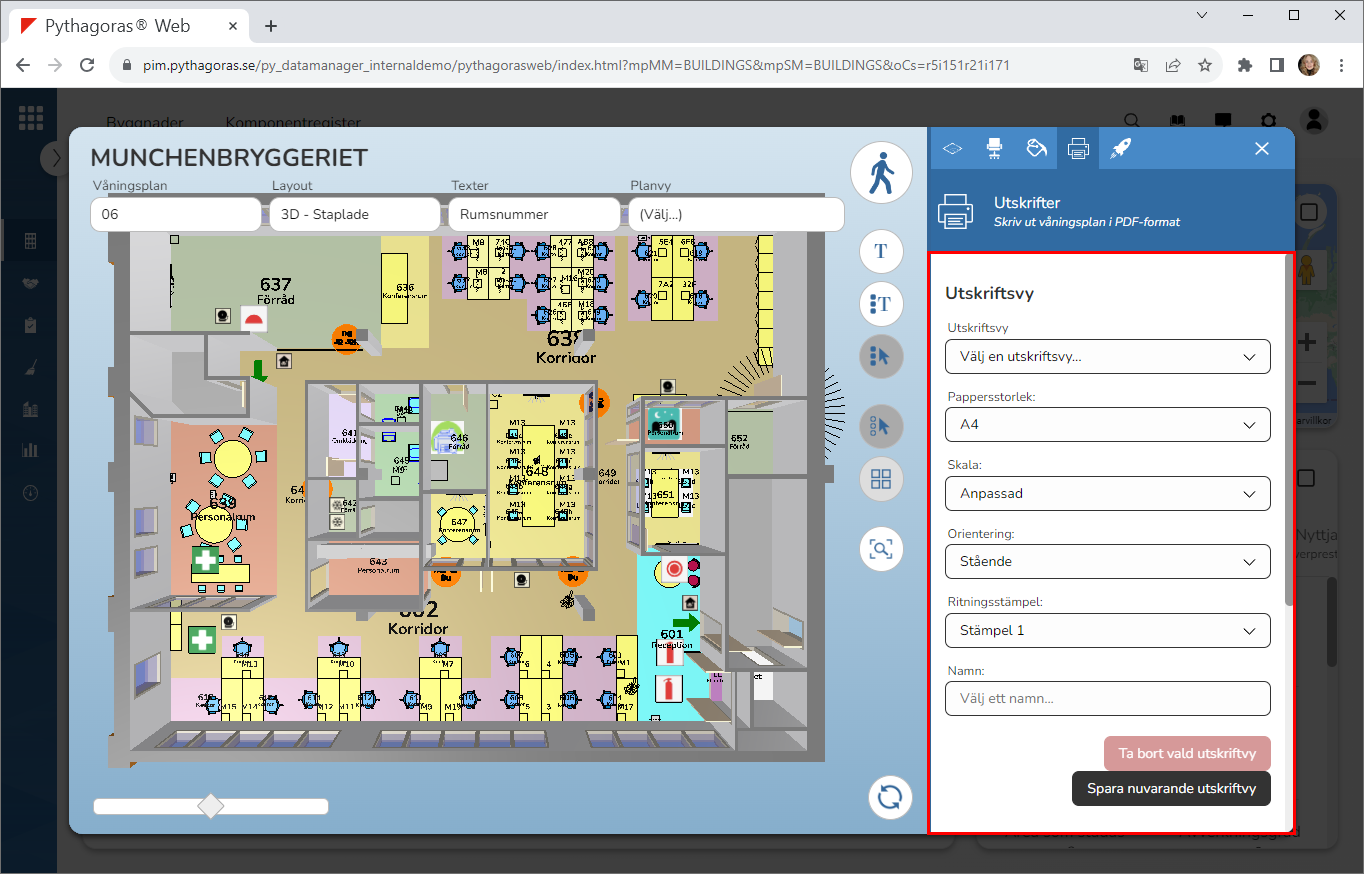 Under rubriken "Utskriftsvy" hittar du sex fält och två knappar (se bilden nedan). Fälten heter "Utskriftsvy", "Pappersstorlek", "Skala", "Orientering", "Ritningsstämpel" och "Namn" medan knapparna heter "Ta bort vald utskriftsvy" och "Spara nuvarande utskriftsvy".