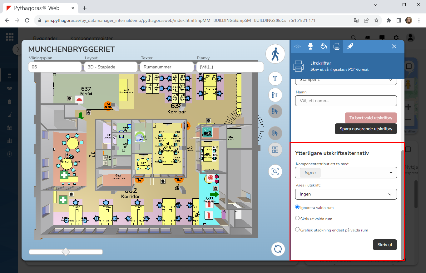 Under rubriken "Ytterligare utskriftsalternativ" hittar du två fält, tre utskriftsalternativ och en knapp med namnet "Skriv ut" (se bilden nedan). Fälten heter "Komponentattribut att ta med" och "Area i utskrift" medan utskriftsalternativen heter "Ignorera valda rum", "Skriv ut valda rum" och "Grafisk utsökning endast på valda rum".
