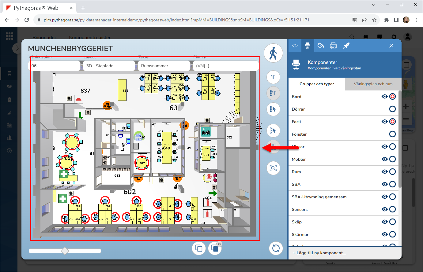 Avmarkera en eller fler komponenter. Detta genom att klicka på en eller fler rödmarkerade komponenter i modellen. Notera att den eller de komponenter du klickar på förlorar sina röda markeringar i modellen och utsökningsfältet (se bilden nedan).