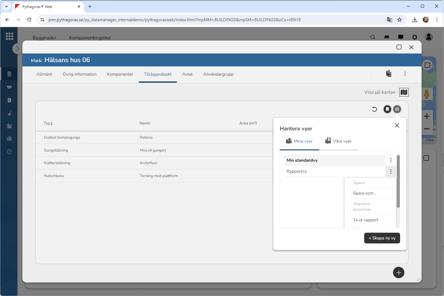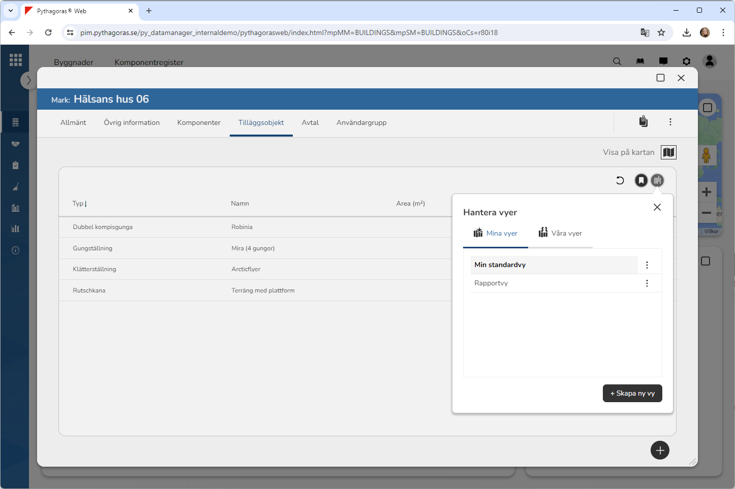 Ställ dig på fliken med namnet "Tilläggsobjekt" (se bilden nedan). Under fliken med namnet "Tilläggsobjekt" hittar du en lista med tilläggsobjekt som är kopplade till det markobjekt du arbetar med.