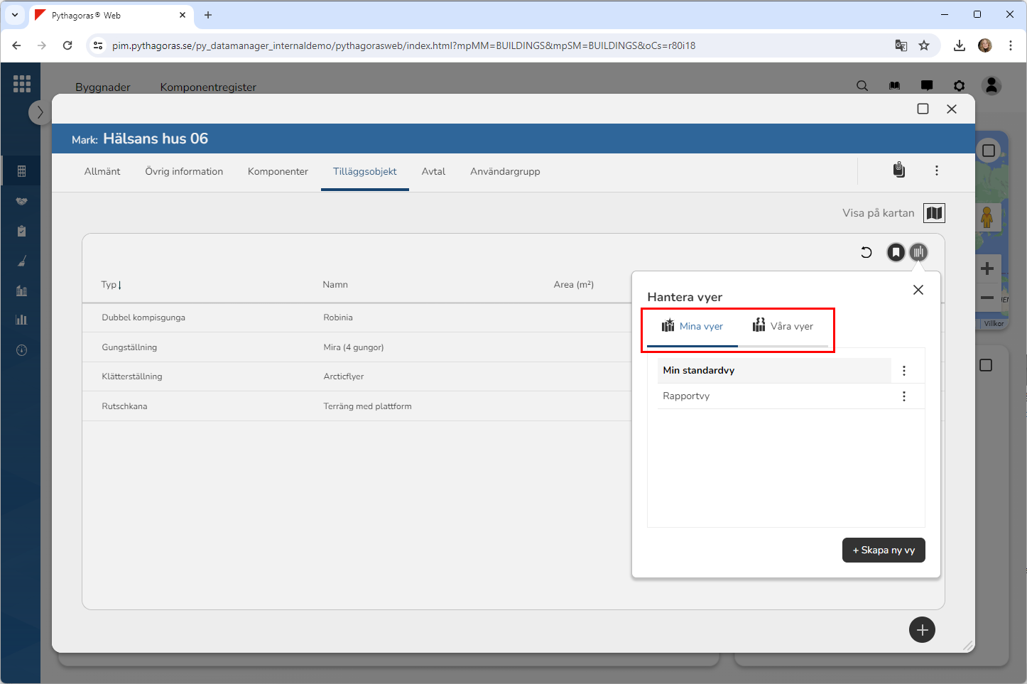 Klicka på ikonen med namnet "Hantera vyer" (se den första bilden nedan). När du klickar på ikonen med namnet "Hantera vyer" får du tillgång till ett vy-fönster som innehåller två listor: "Mina vyer" och "Våra vyer" (se den andra bilden nedan). I listan med namnet "Mina vyer" hittar du personliga vyer, det vill säga vyer som bara är tillgängliga för dig. I listan med namnet "Våra vyer" hittar du organisationsvyer, det vill säga vyer som är tillgängliga för alla användare i din organisation.