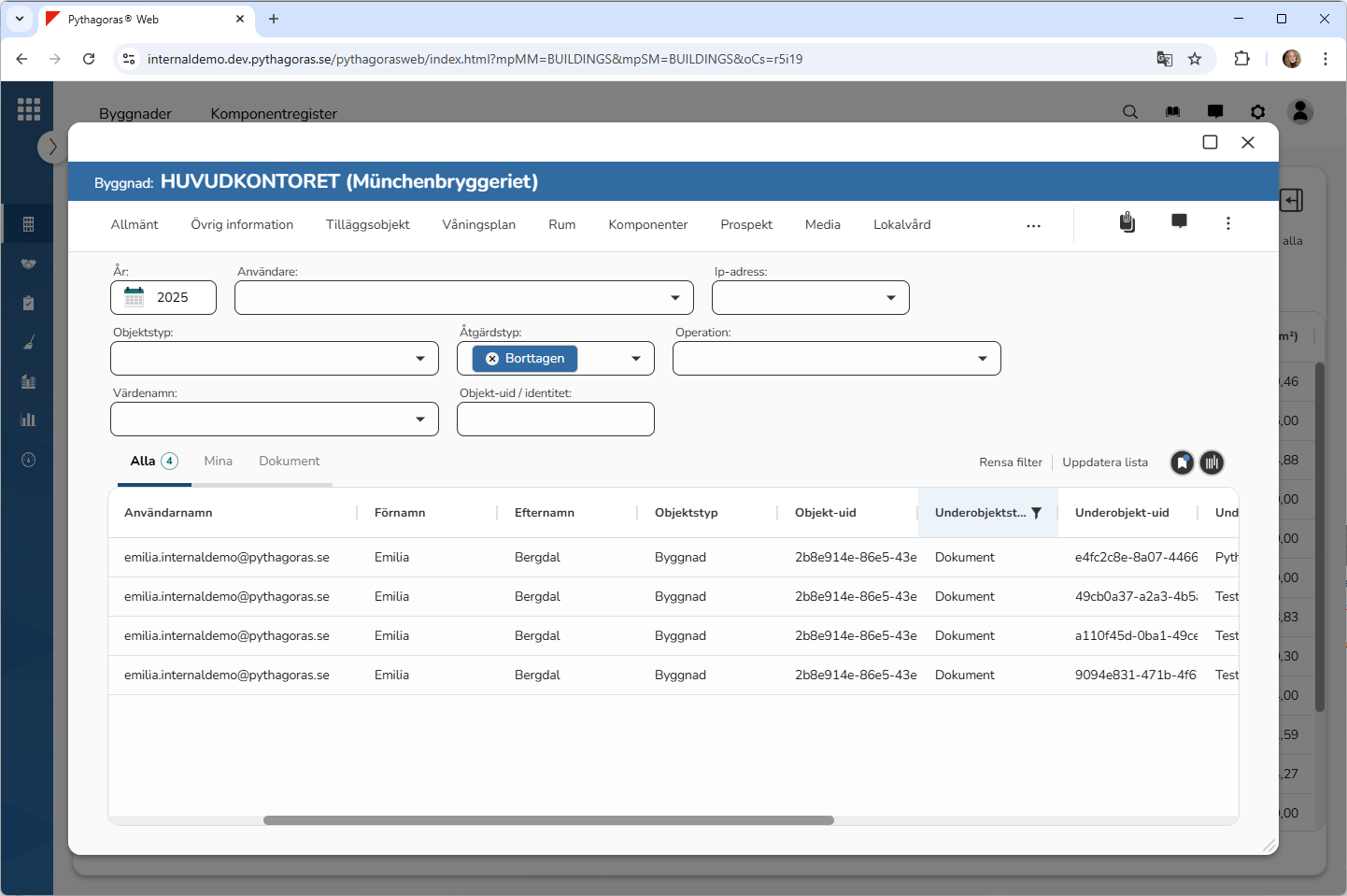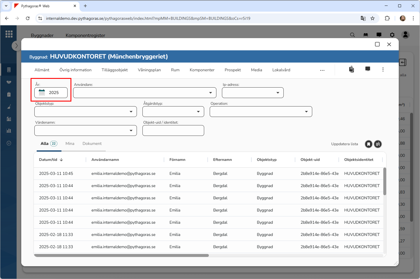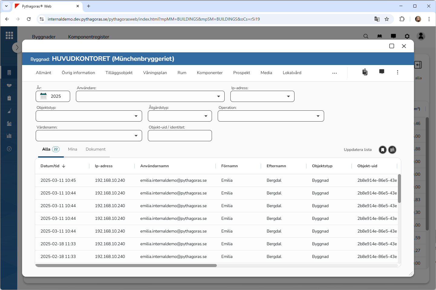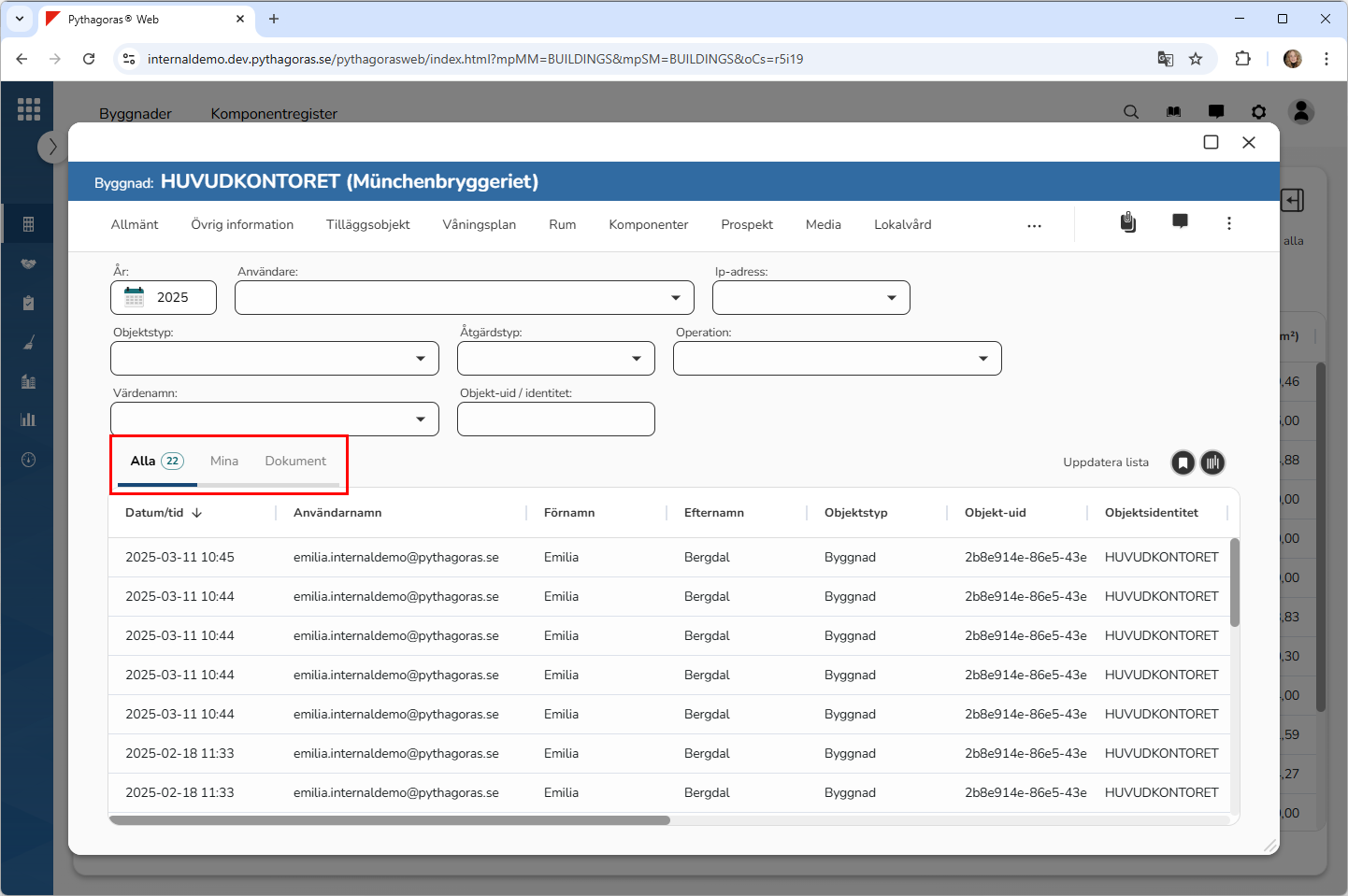 Öppna aktivitetsloggen för en byggnad. För mer information om hur du öppnar aktivitetsloggen för en byggnad, se avsnitt 8.15.1.