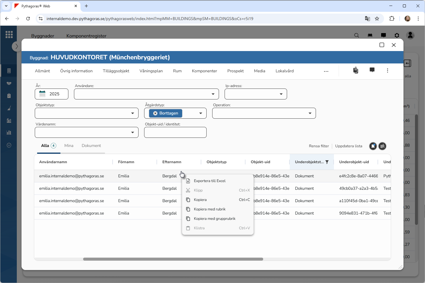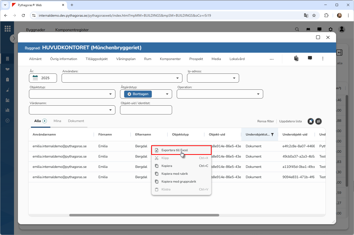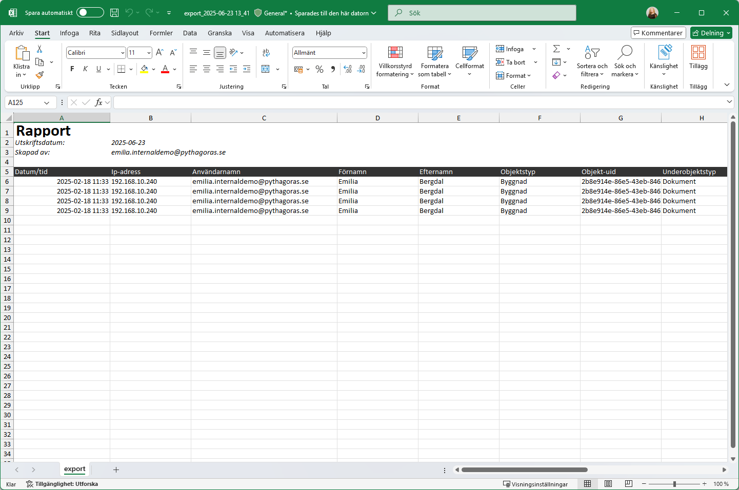Klicka på "Exportera till Excel" i den meny du har fått tillgång till (se den första bilden nedan). När du klickar på "Exportera till Excel" kommer aktivitetsloggen att exporteras till Excel (se den andra bilden nedan).