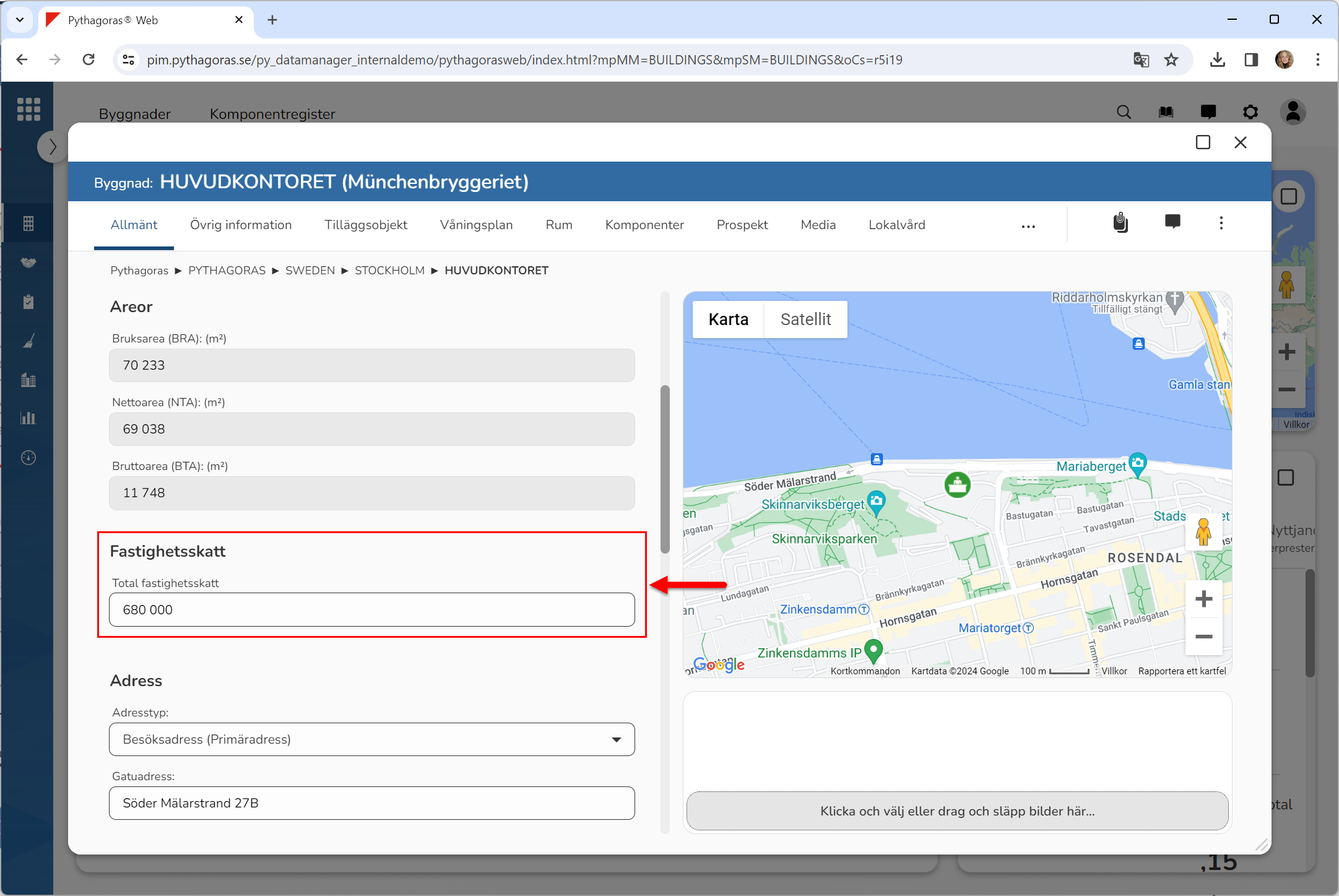 Via fältet med namnet "Total fastighetsskatt" kan du sätta och och byta fastighetsskatt på en byggnad.