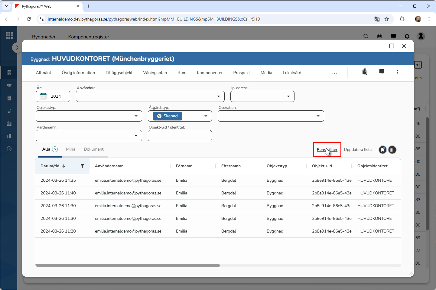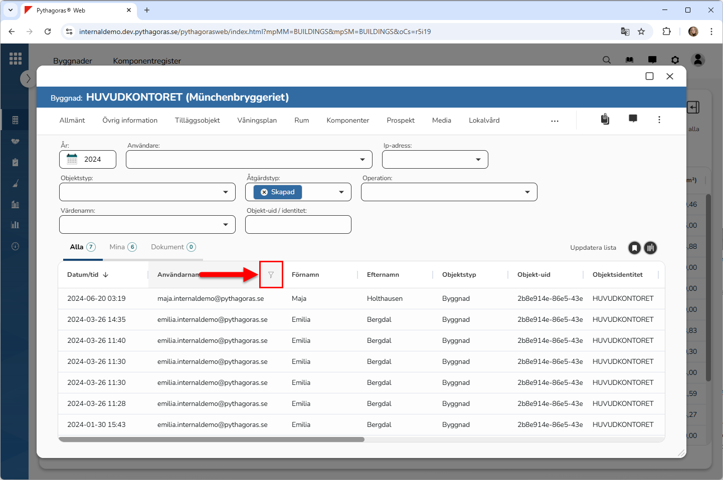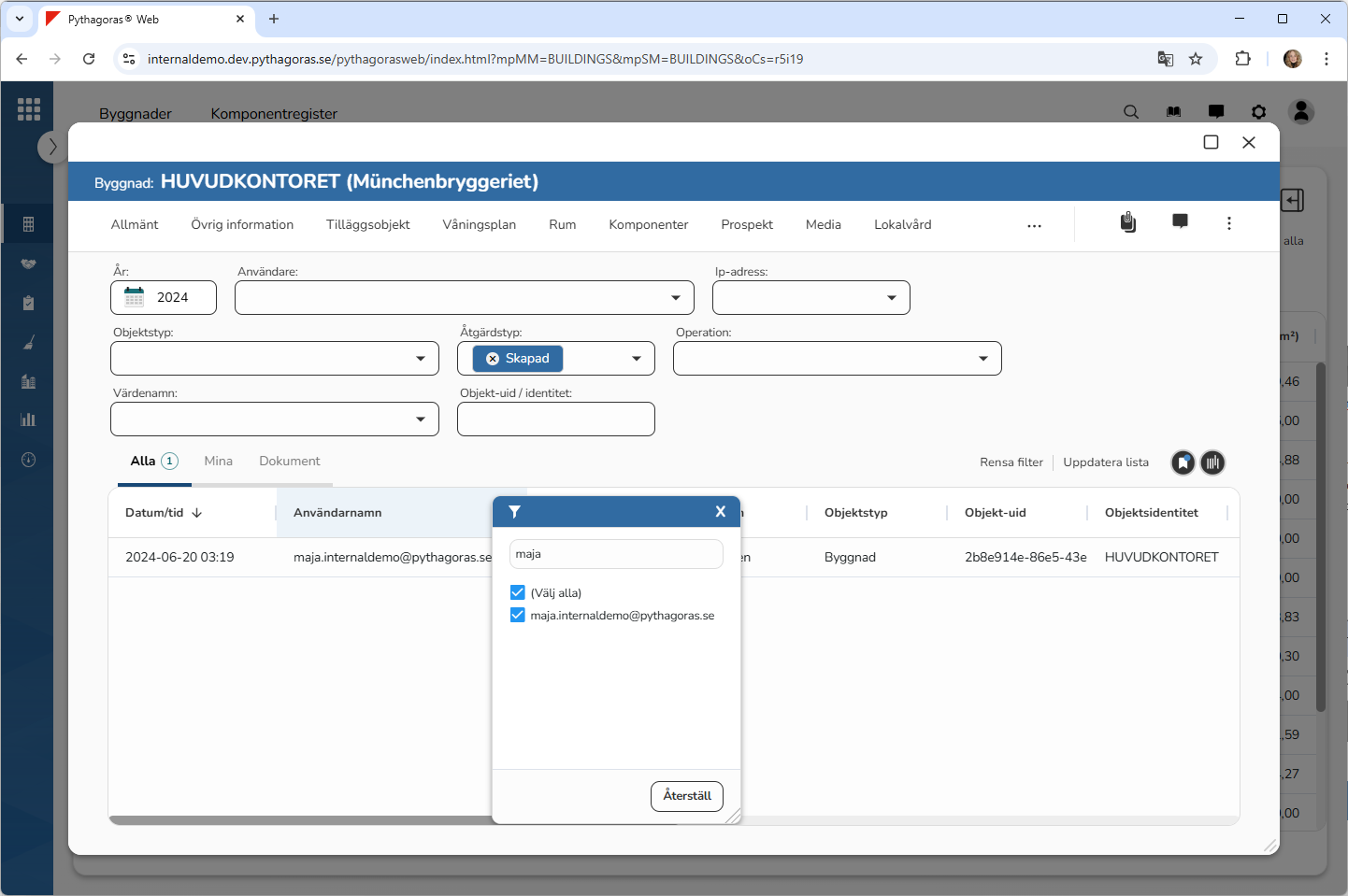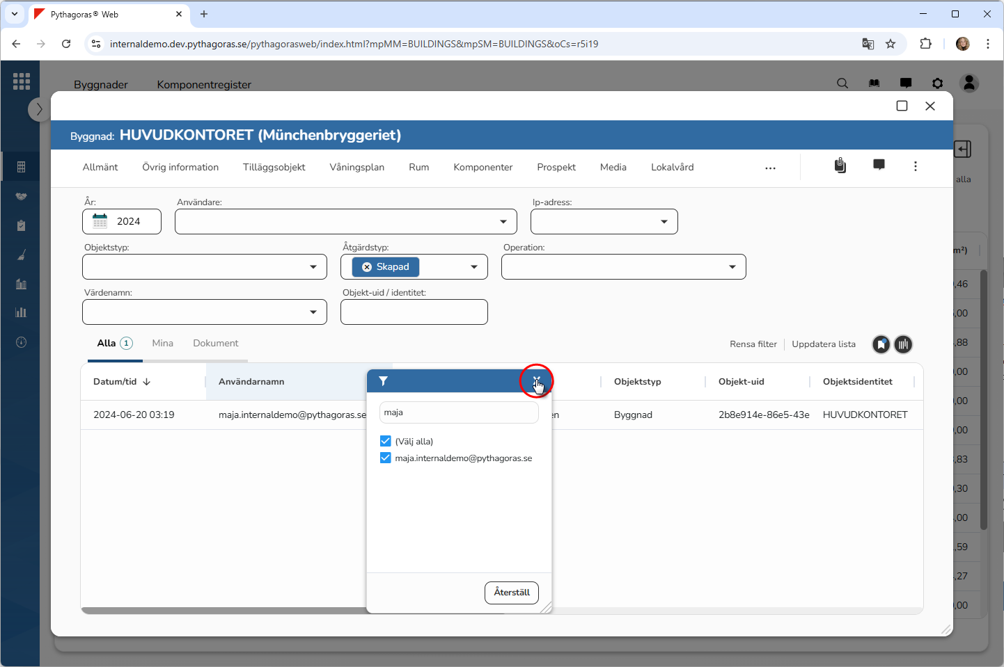 Stäng filterrutan genom att kryssa ner den eller klicka utanför den (se den första bilden nedan). När du stänger filterrutan skickas du tillbaka till aktivitetsloggen. I aktivitetsloggen hittar du den eller de aktiviteter som har kunnat matchas mot det eller de objekt du har filtrerat på. Vår filtrering på aktiviteter kopplade till användaren med användarnamnet "maja.internaldemo@pythagoras.se" gav oss en sökträff (se den andra bilden nedan). Om du vill göra din filtrering smalare kan du filtrera i någon eller några av de kolumner du inte redan har filtrerat i. För mer information om hur du rensar aktivitetsloggen på kolumnfiltrering eller återställer en kolumn efter att du har filtrerat i den, se slutet av detta avsnitt.