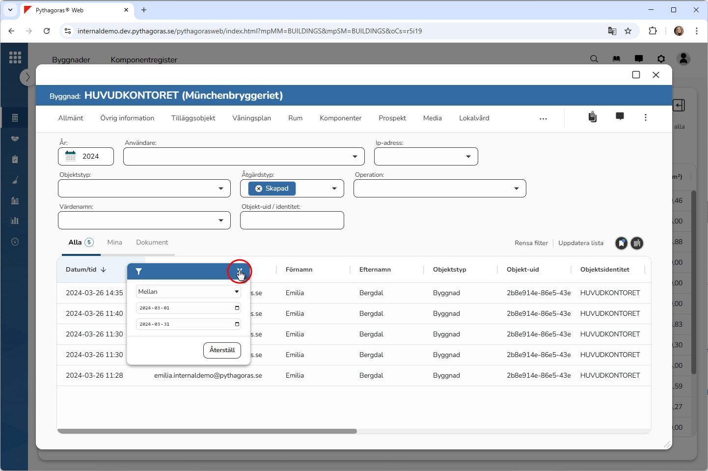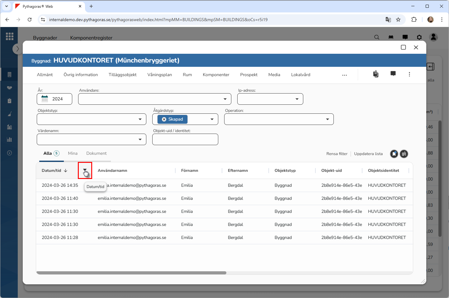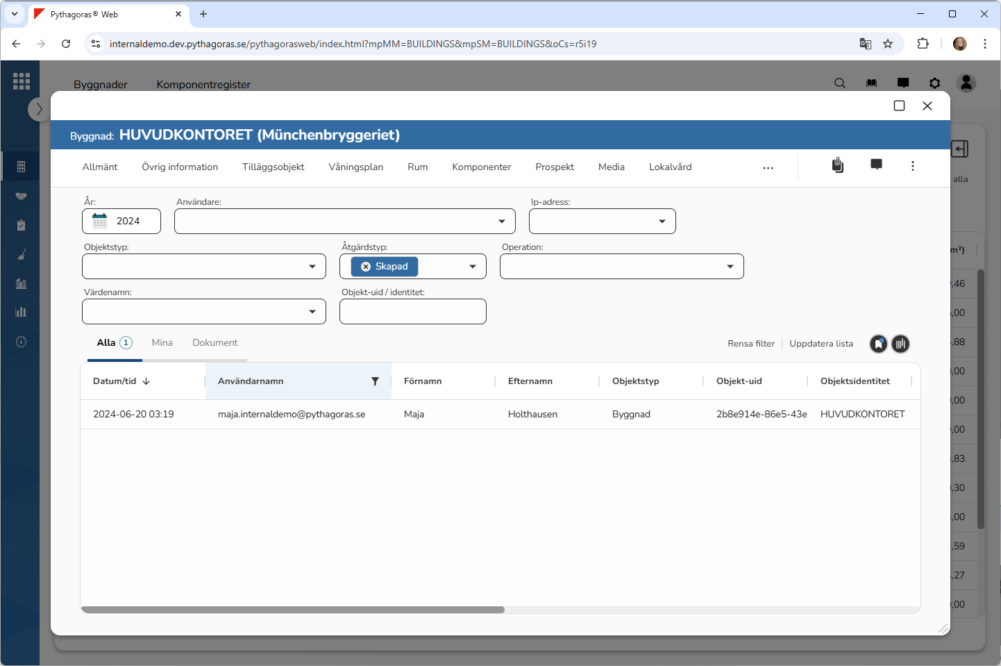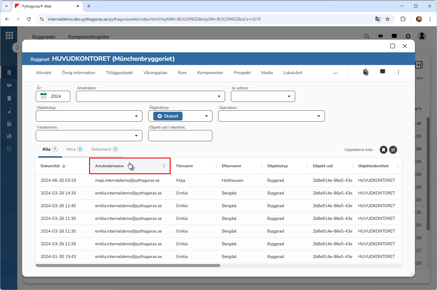 Stäng filterrutan genom att kryssa ner den eller klicka utanför den (se den första bilden nedan). När du stänger filterrutan skickas du tillbaka till aktivitetsloggen. I aktivitetsloggen hittar du den eller de aktiviteter som har kunnat matchas mot det eller de objekt du har filtrerat på. Vår filtrering på aktiviteter kopplade till användaren med användarnamnet "maja.internaldemo@pythagoras.se" gav oss en sökträff (se den andra bilden nedan). Om du vill göra din filtrering smalare kan du filtrera i någon eller några av de kolumner du inte redan har filtrerat i. För mer information om hur du rensar aktivitetsloggen på kolumnfiltrering eller återställer en kolumn efter att du har filtrerat i den, se slutet av detta avsnitt.