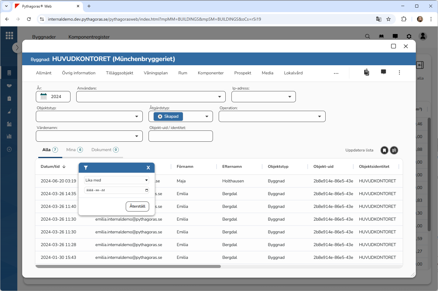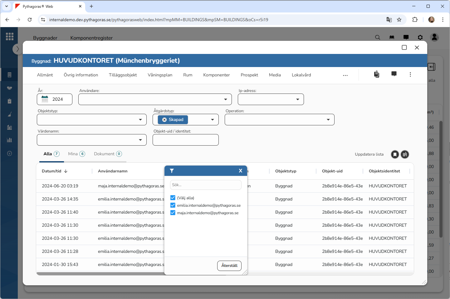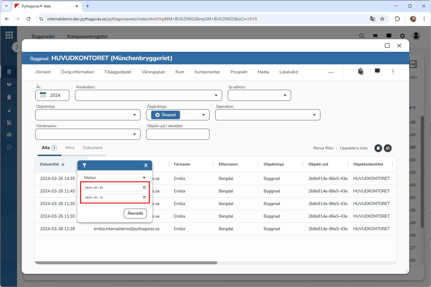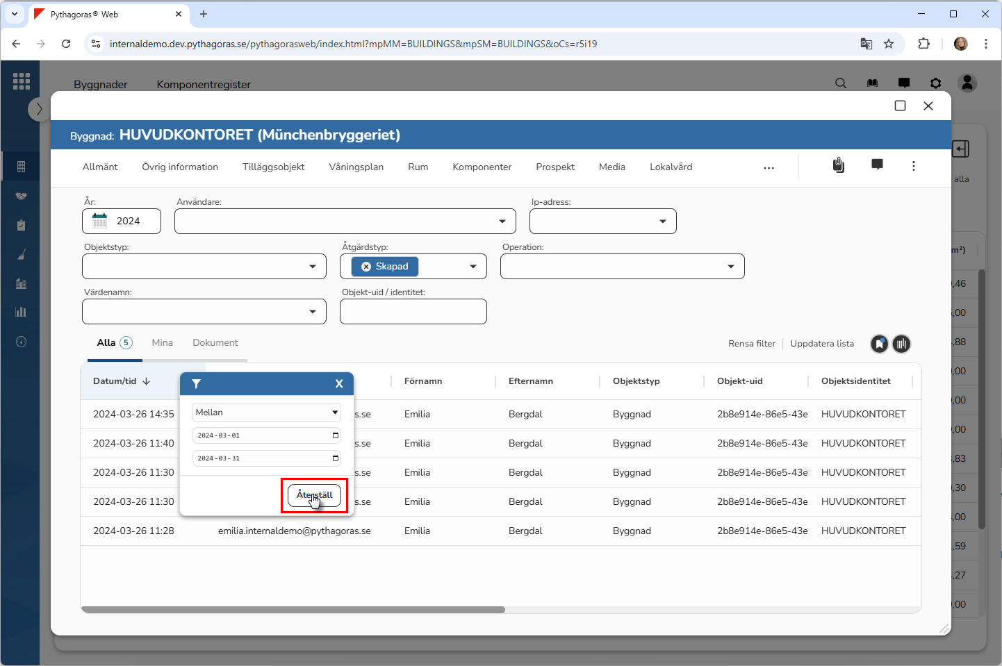 Stäng filterrutan genom att kryssa ner den eller klicka utanför den (se den första bilden nedan). När du stänger filterrutan skickas du tillbaka till aktivitetsloggen. I aktivitetsloggen hittar du den eller de aktiviteter som har kunnat matchas mot det eller de objekt du har filtrerat på. Vår filtrering på aktiviteter kopplade till användaren med användarnamnet "maja.internaldemo@pythagoras.se" gav oss en sökträff (se den andra bilden nedan). Om du vill göra din filtrering smalare kan du filtrera i någon eller några av de kolumner du inte redan har filtrerat i. För mer information om hur du rensar aktivitetsloggen på kolumnfiltrering eller återställer en kolumn efter att du har filtrerat i den, se slutet av detta avsnitt.