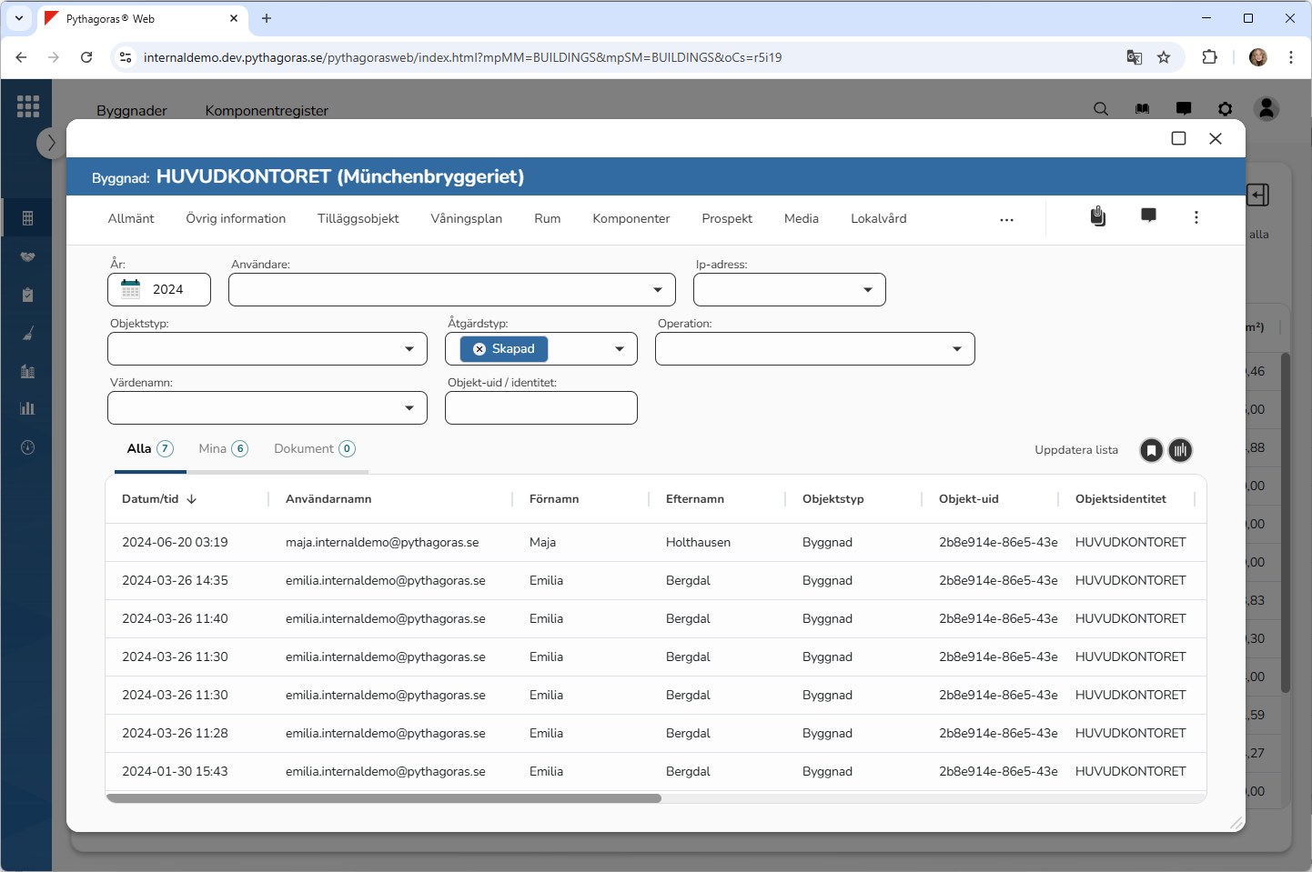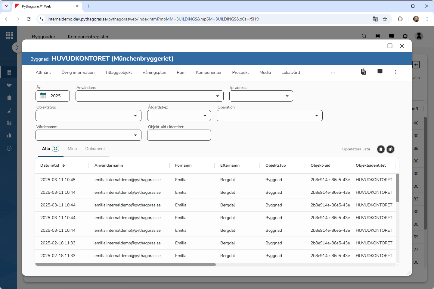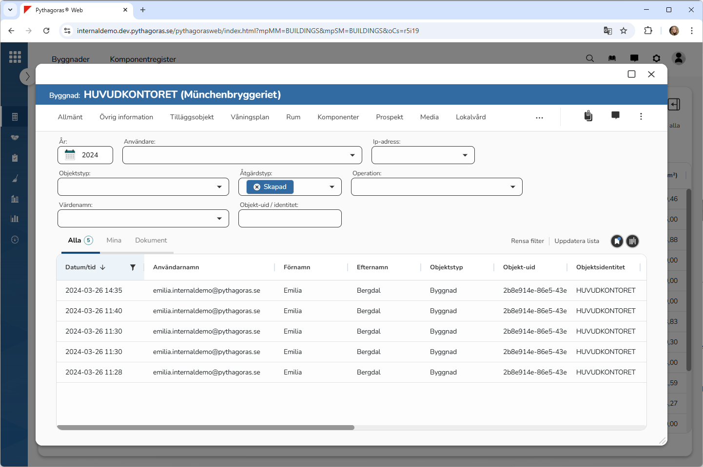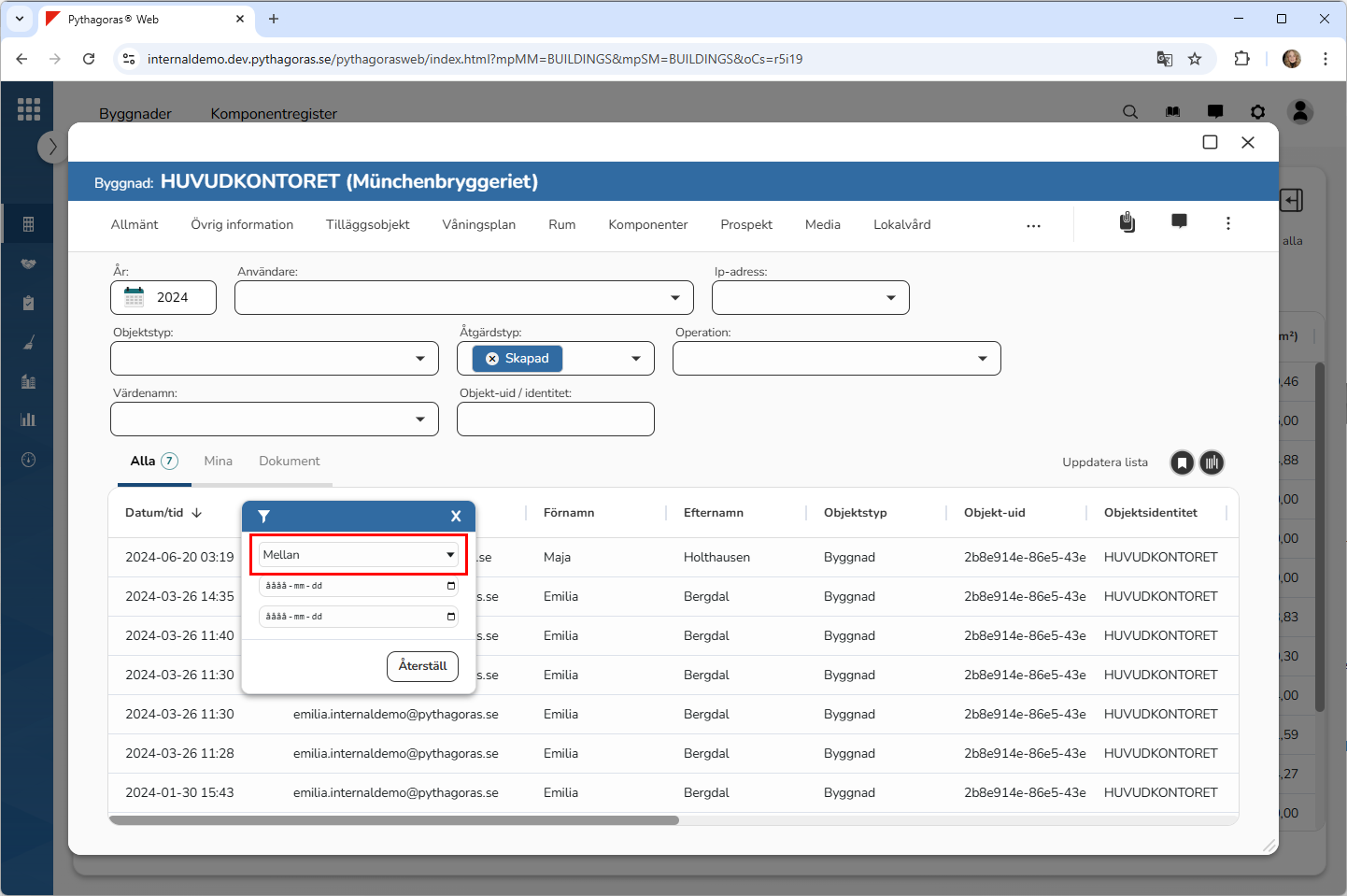 Stäng filterrutan genom att kryssa ner den eller klicka utanför den (se den första bilden nedan). När du stänger filterrutan skickas du tillbaka till aktivitetsloggen. I aktivitetsloggen hittar du den eller de aktiviteter som har kunnat matchas mot det eller de objekt du har filtrerat på. Vår filtrering på aktiviteter kopplade till användaren med användarnamnet "maja.internaldemo@pythagoras.se" gav oss en sökträff (se den andra bilden nedan). Om du vill göra din filtrering smalare kan du filtrera i någon eller några av de kolumner du inte redan har filtrerat i. För mer information om hur du rensar aktivitetsloggen på kolumnfiltrering eller återställer en kolumn efter att du har filtrerat i den, se slutet av detta avsnitt.