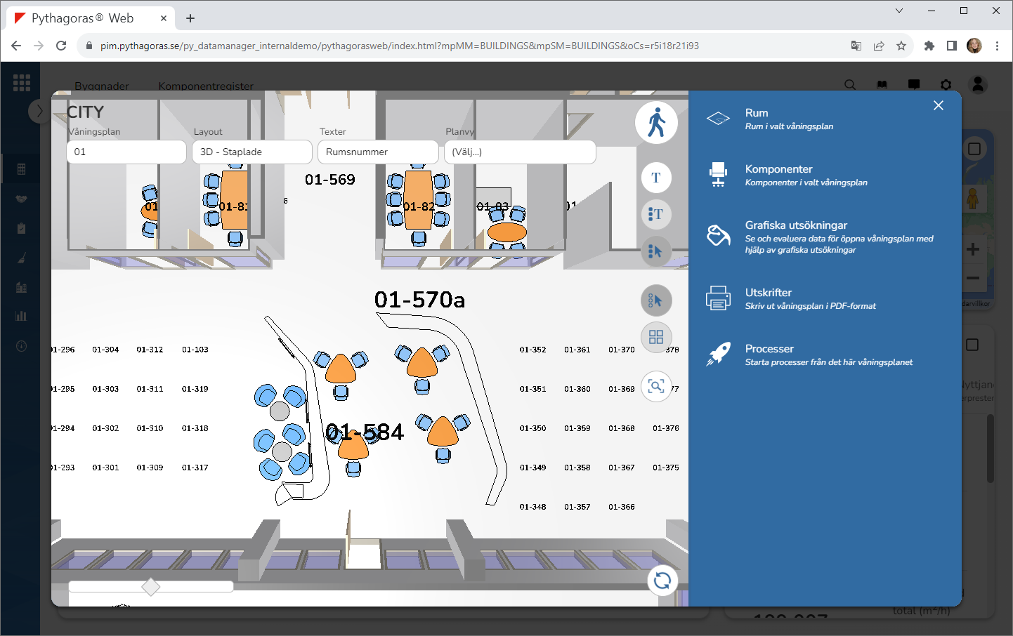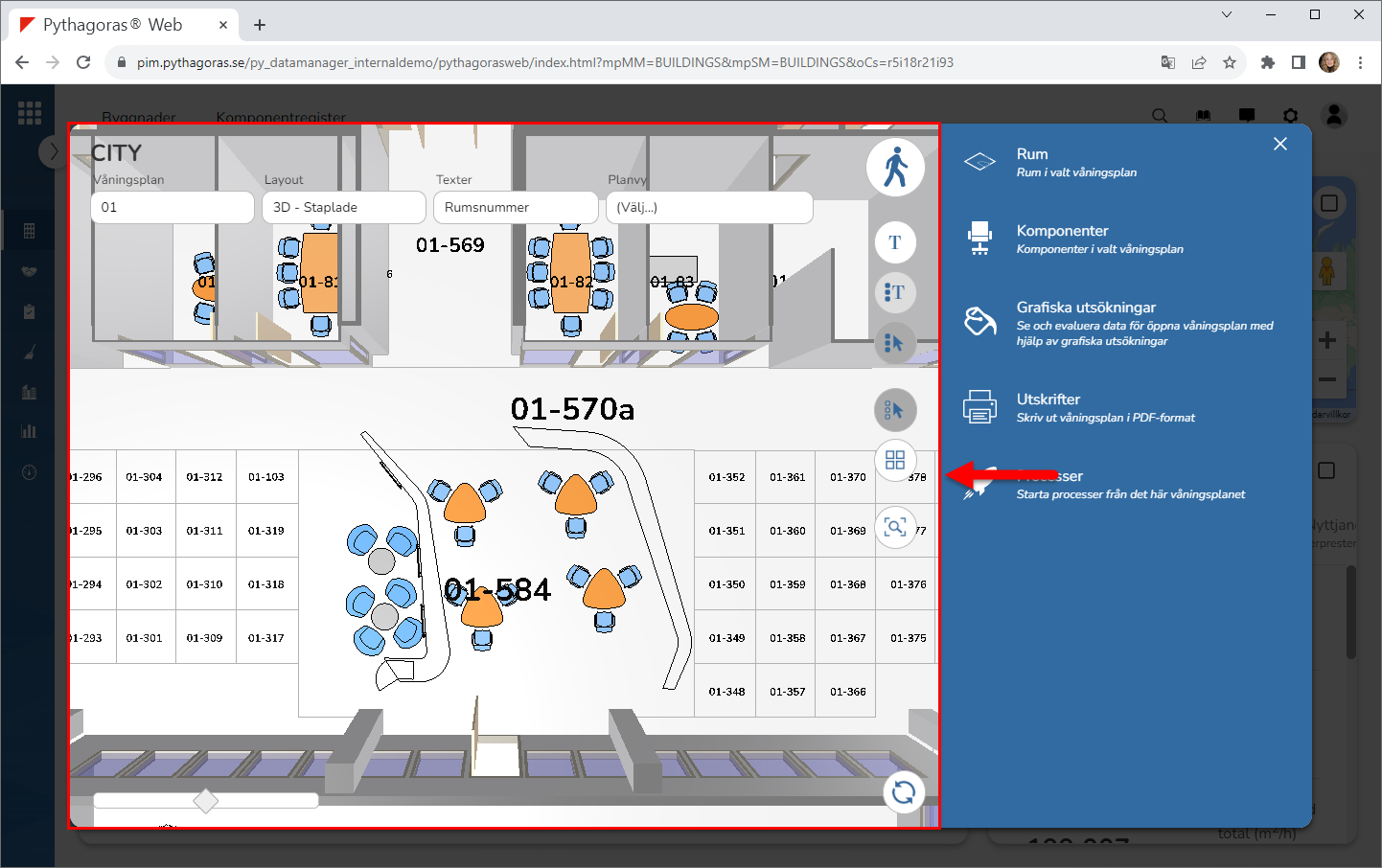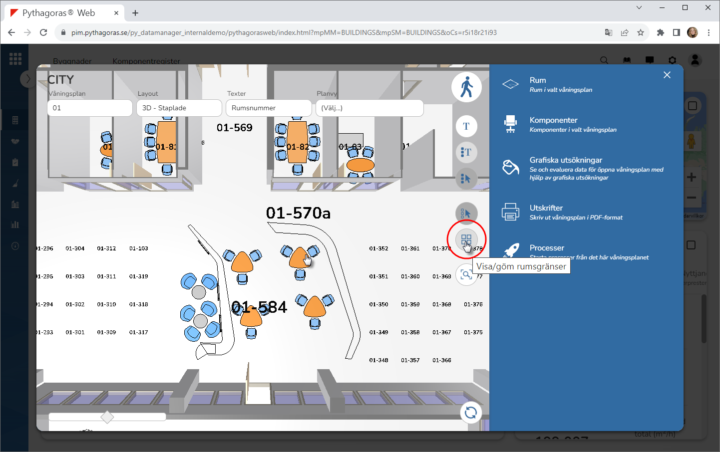 Klicka på ikonen med namnet "Visa/göm rumsgränser" (se den första bilden nedan). När du klickar på ikonen med namnet "Visa/göm rumsgränser" kommer rumsgränser att gömmas i modellen (se den andra bilden nedan).