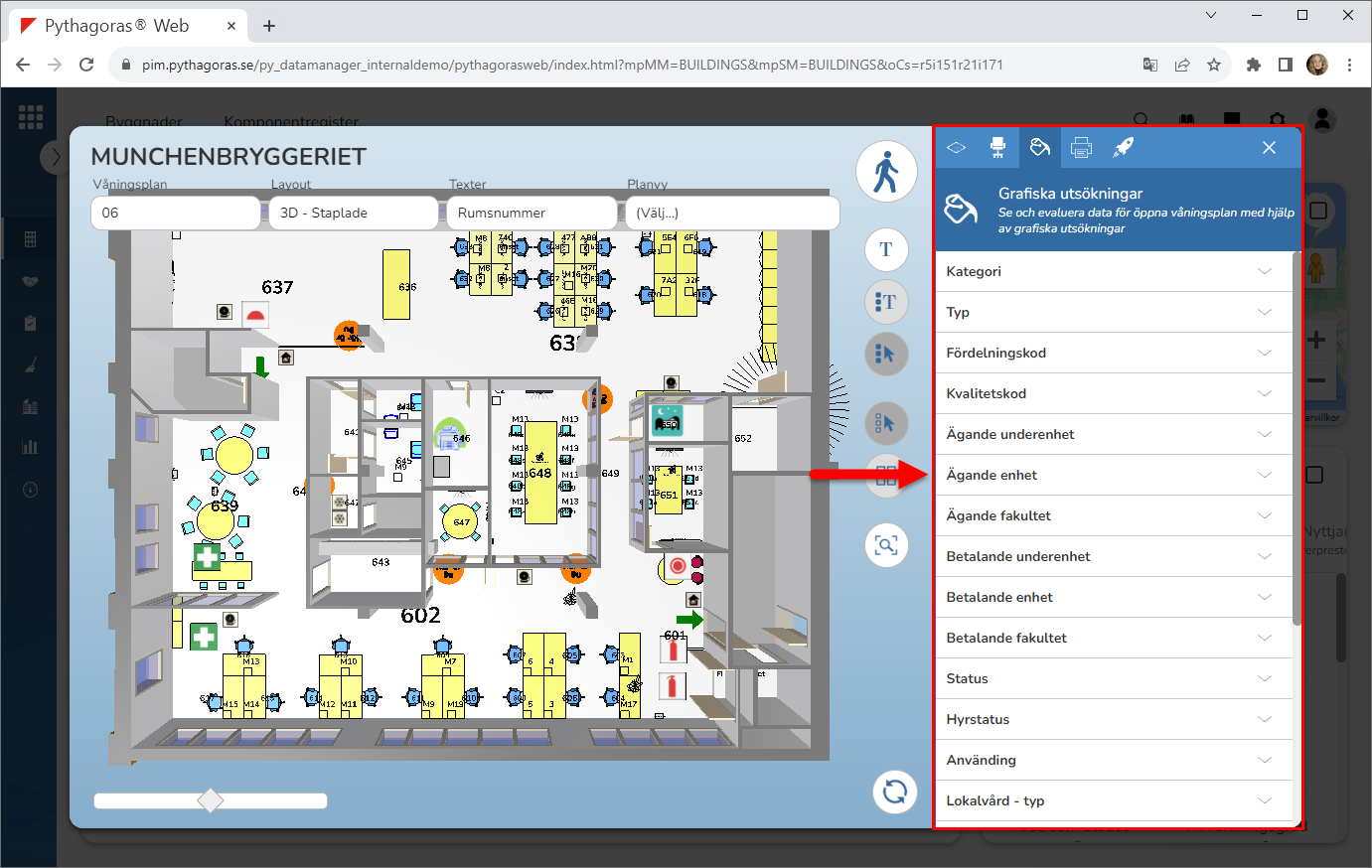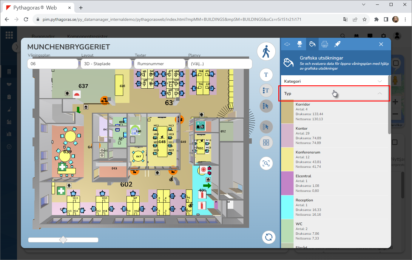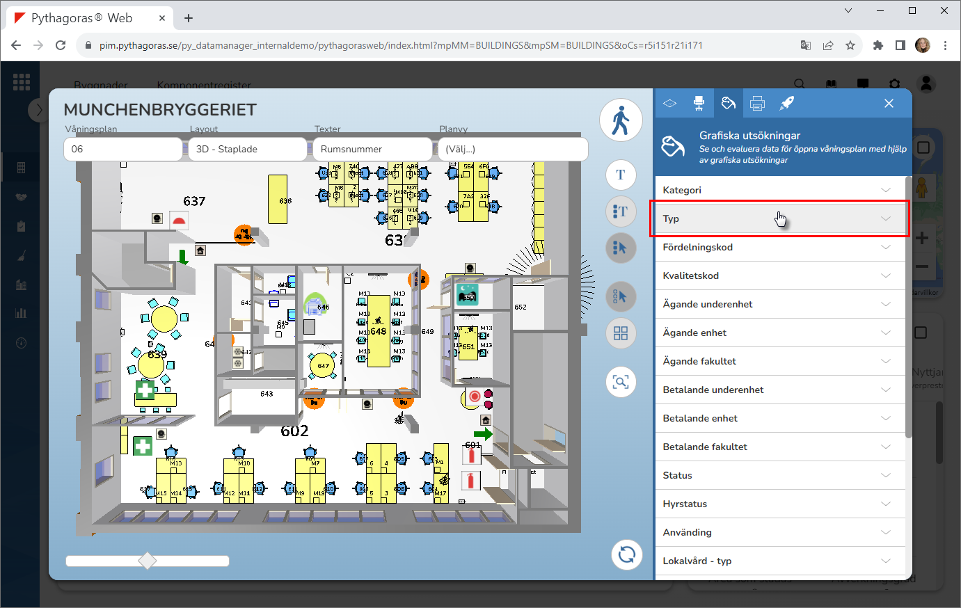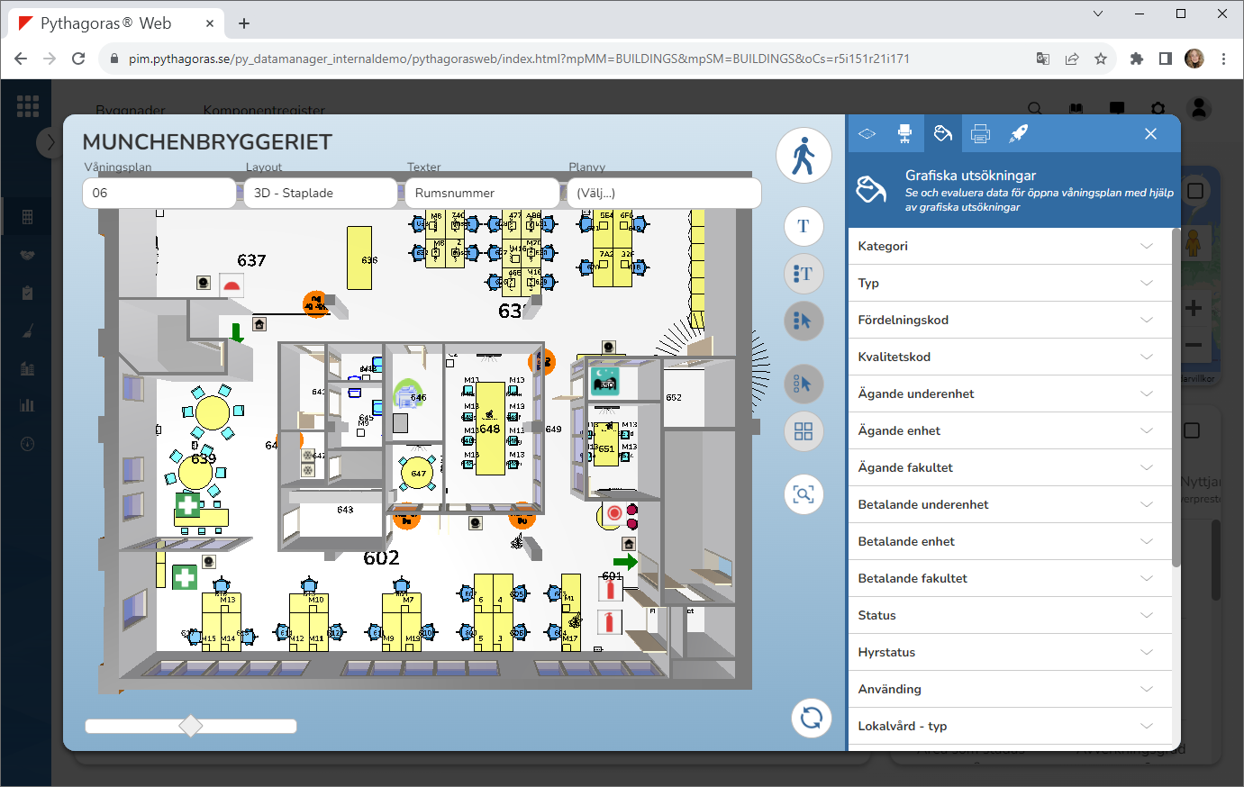 Med hjälp av grafiska utsökningar kan du visa olika värden i modellen. Ett värde kan till exempel vara "Kategori", "Typ", "Fördelningskod", "Kvalitetskod", "Betalande kostnadsställe" eller "Status".