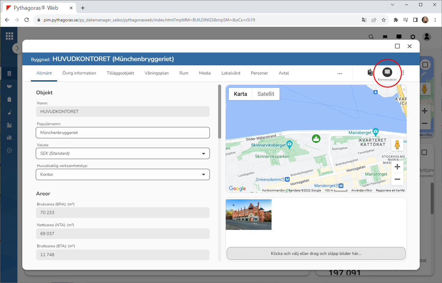 Via Konversationsikonen kan du lägga till, redigera och ta bort kommentarer från en byggnad. Notera att du bara kan redigera och ta bort kommentar du själv lagt till på en byggnad.