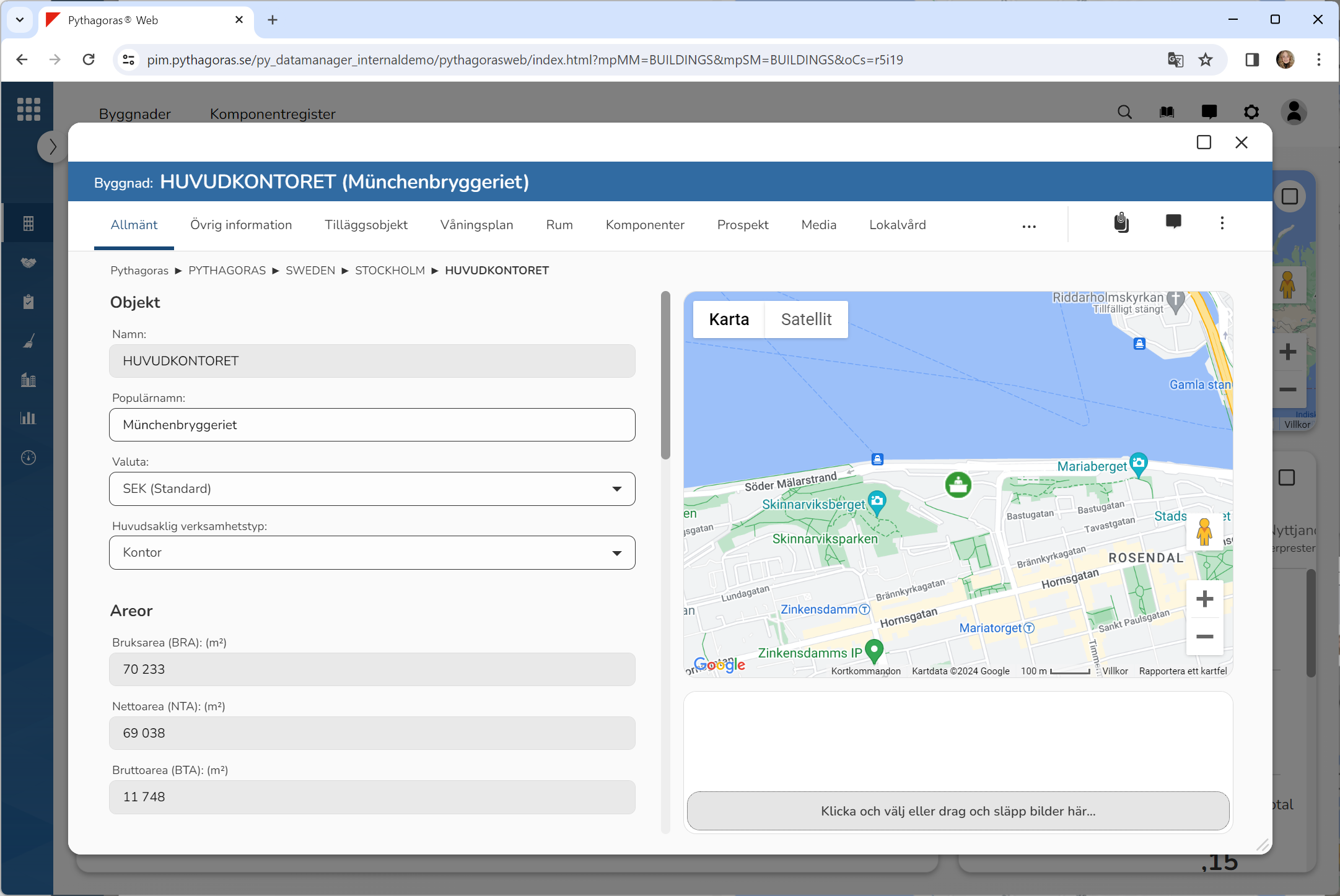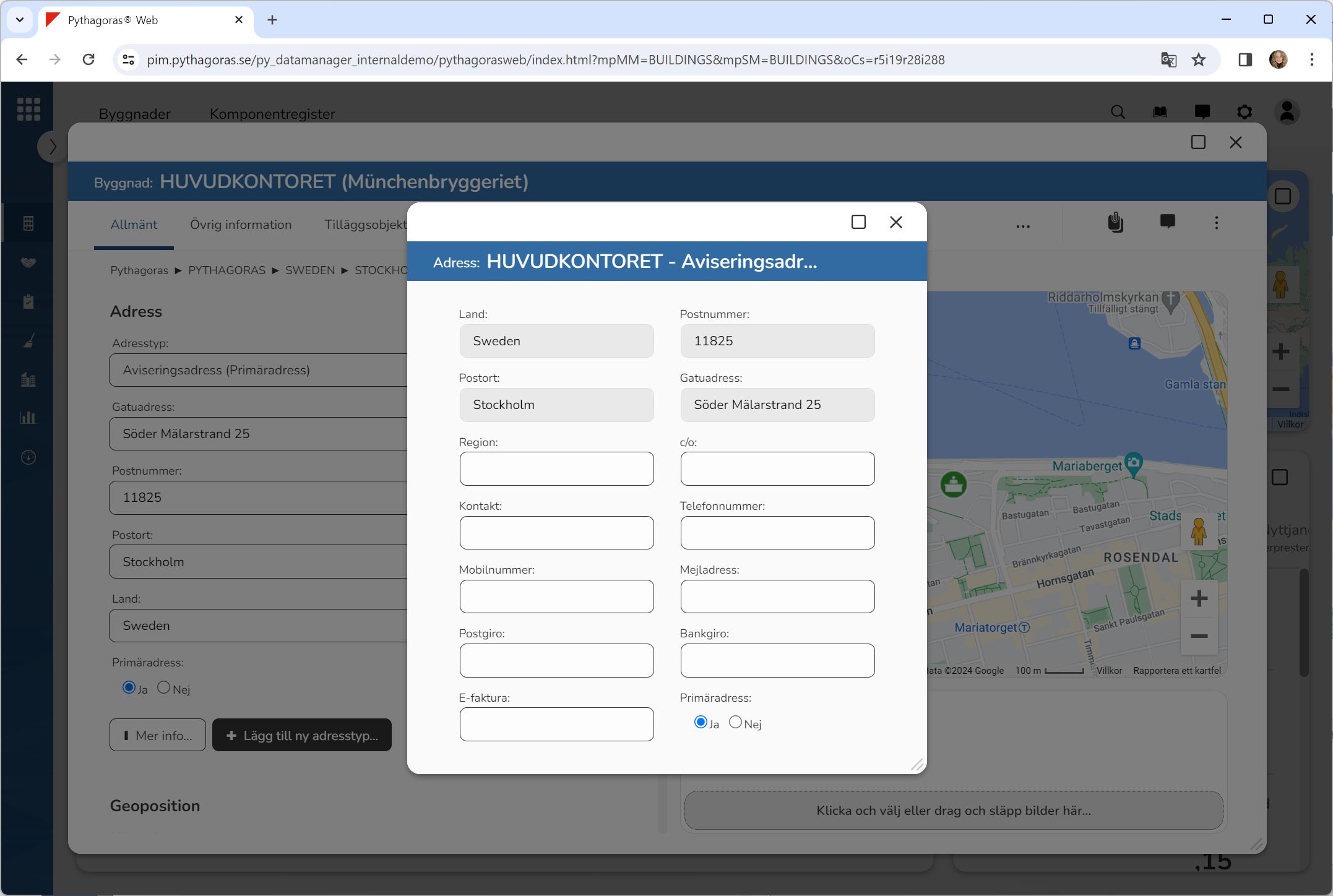 Sätt en gatuadress, ett postnummer, en postort och ett land på den adress du har kopplat till den byggnad du arbetar med (se bilden nedan). Detta via fälten med namnen "Gatuadress", "Postnummer", "Postort" och "Land".