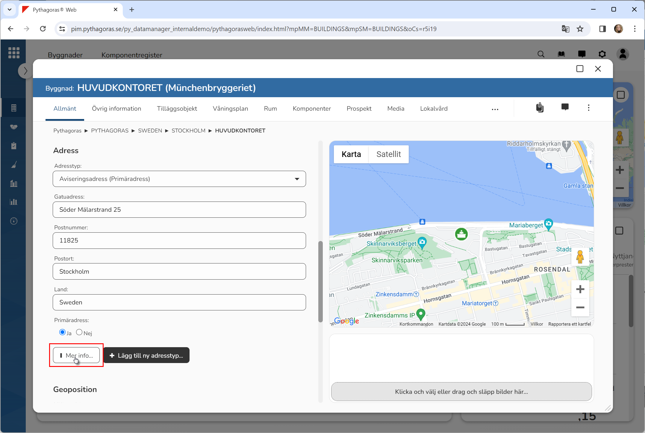 Klicka på knappen med namnet "Mer info" (se den första bilden nedan). När du klickar på knappen med namnet "Mer info" får du tillgång till ett adresskort via vilket du kan sätta mer information på den adress du har kopplat till den byggnad du arbetar med (se den andra bilden nedan). Obs! Om du inte vill sätta mer information på den adress du har kopplat till den byggnad du arbetar med kan du bortse från detta instruktionssteg.