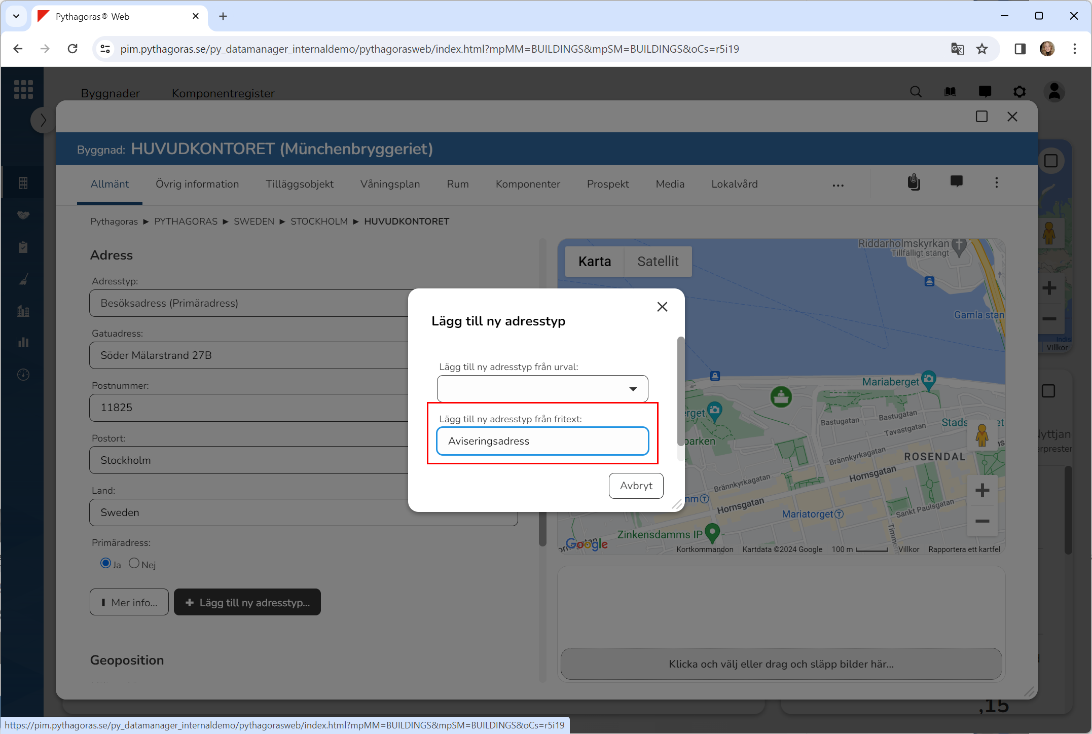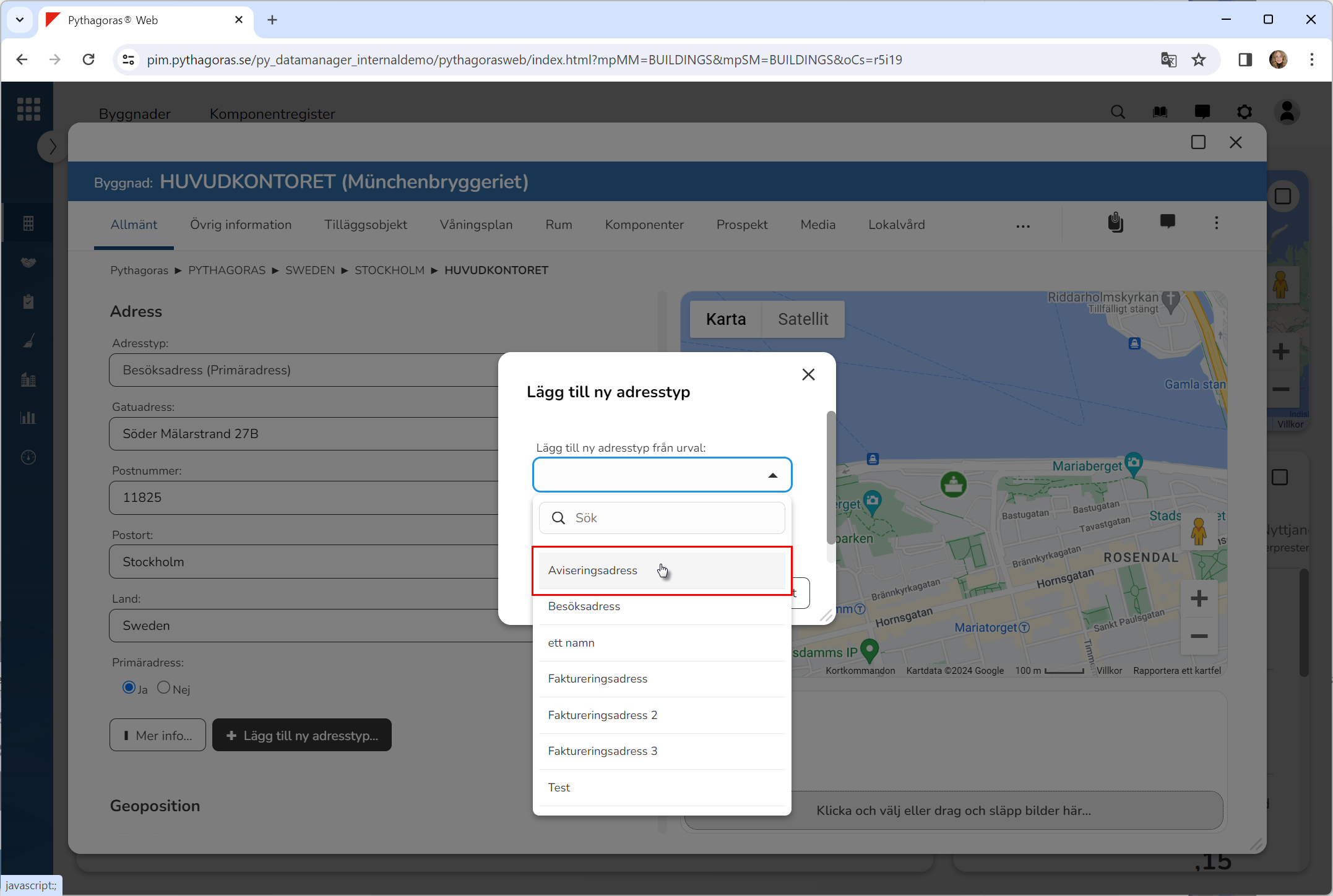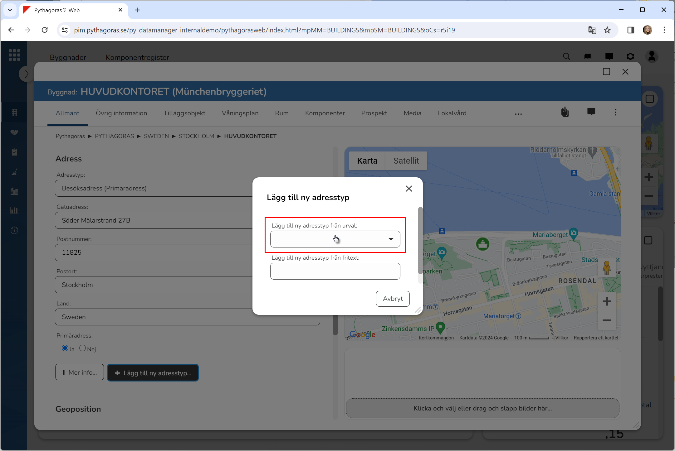 Ange vilken typ av adress du vill koppla till den byggnad du arbetar med. Detta genom att