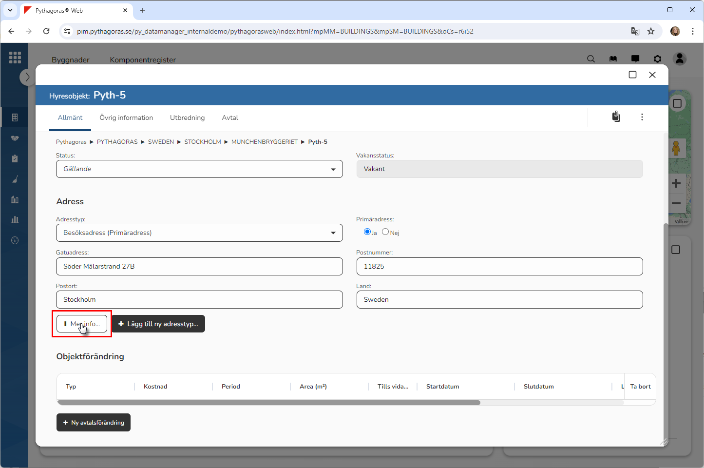 Klicka på knappen med namnet "Mer info" (se den första bilden nedan). När du klickar på knappen med namnet "Mer info" får du tillgång till ett adresskort via vilket du kan sätta mer information på den adress du har kopplat till det hyresobjekt du arbetar med (se den andra bilden nedan). Obs! Om du inte vill sätta mer information på den adress du har kopplat till det hyresobjekt du arbetar med kan du bortse från detta instruktionssteg.