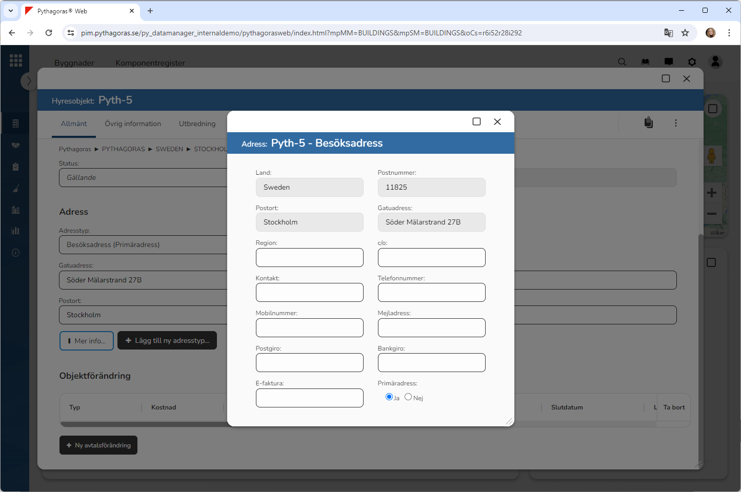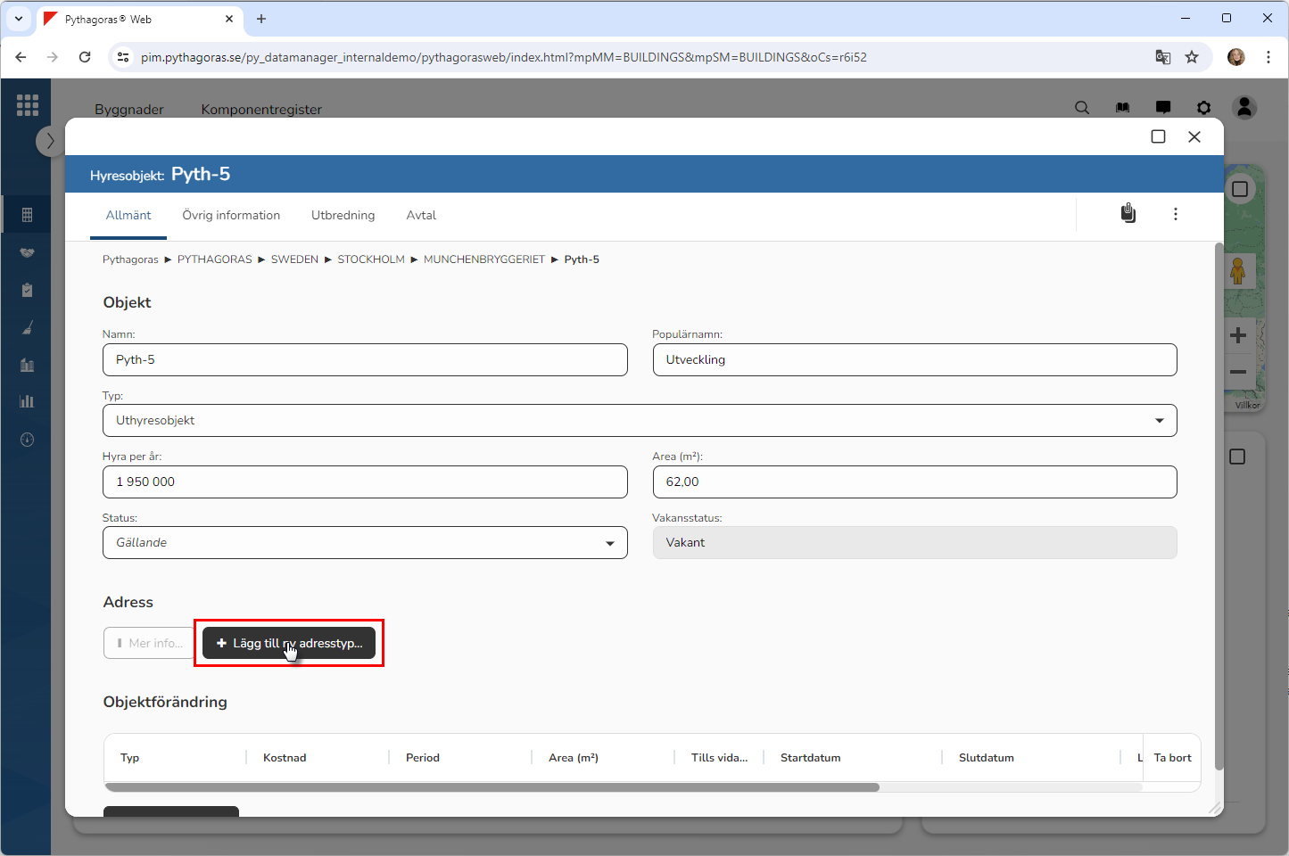 Gå till hyresobjektskortet. I hyresobjektskortet ser du att en adress av den typ du har angett att du velat koppla till det hyresobjekt du arbetar med, har kopplats till hyresobjektet (se bilden nedan).