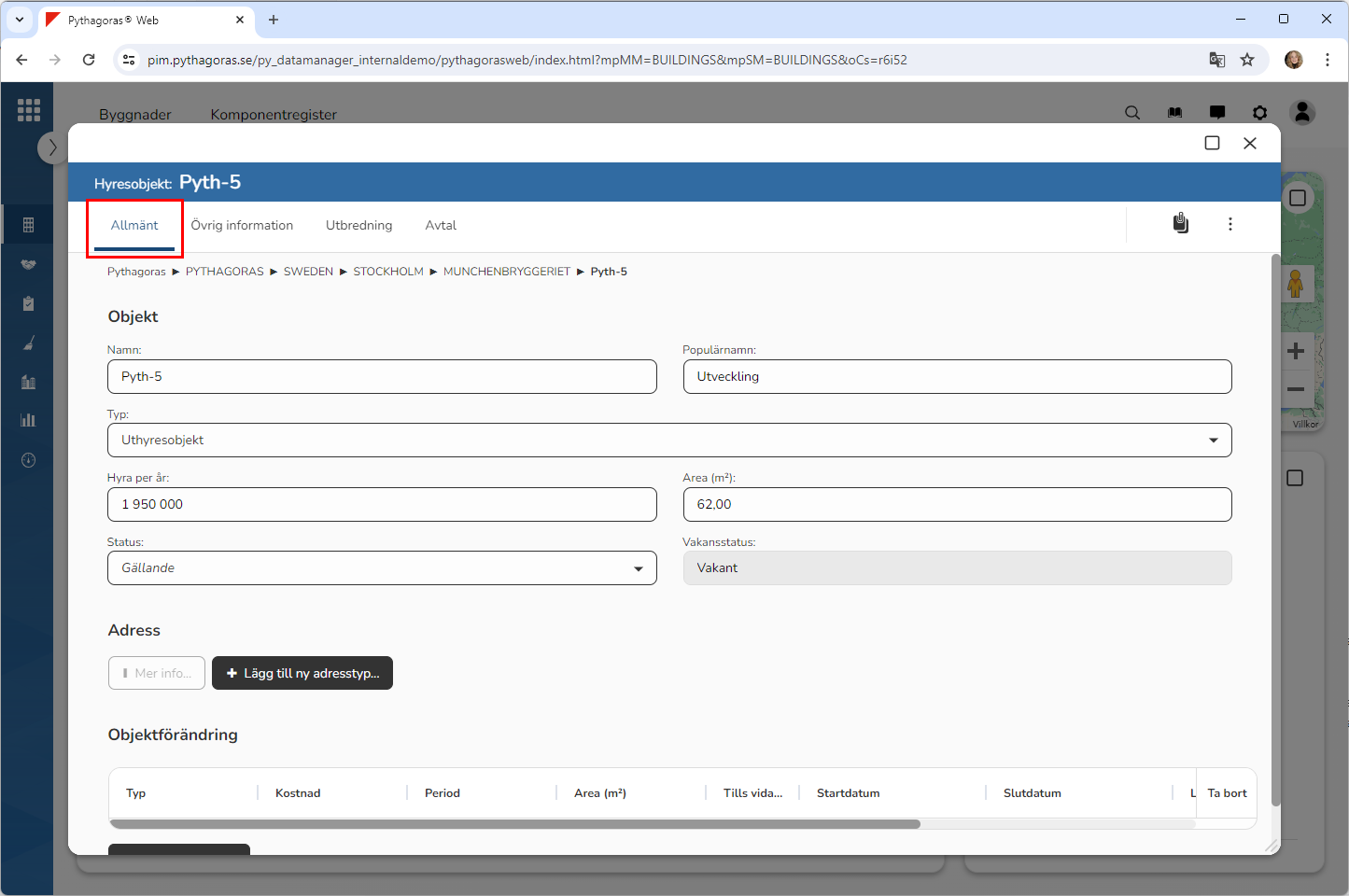 Öppna det hyresobjekt du vill koppla en adress till. För mer information om hur du öppnar ett hyresobjekt, se avsnitt 11.1.
