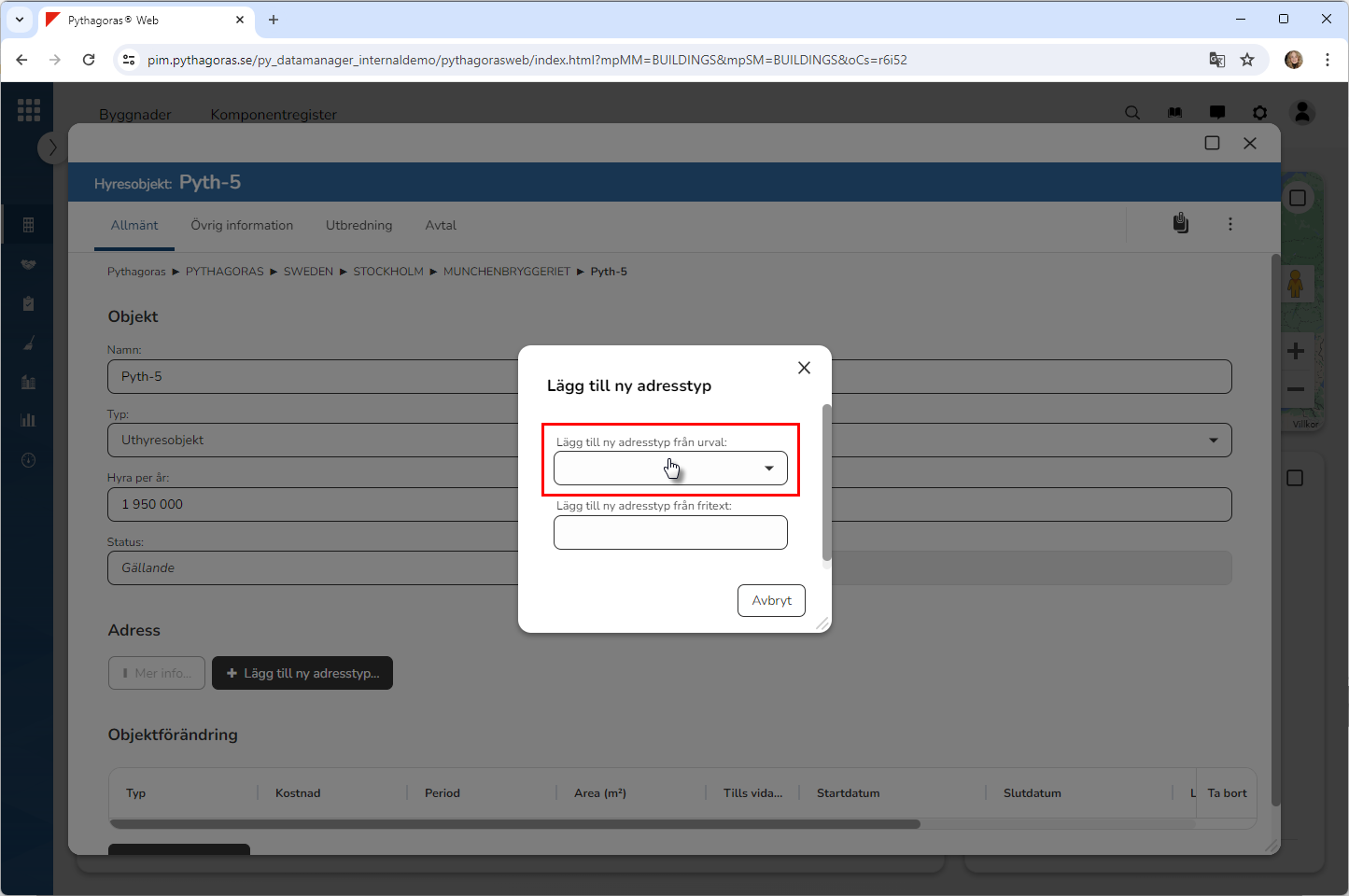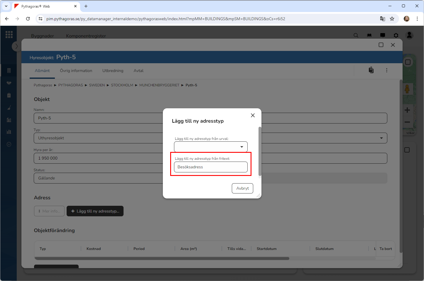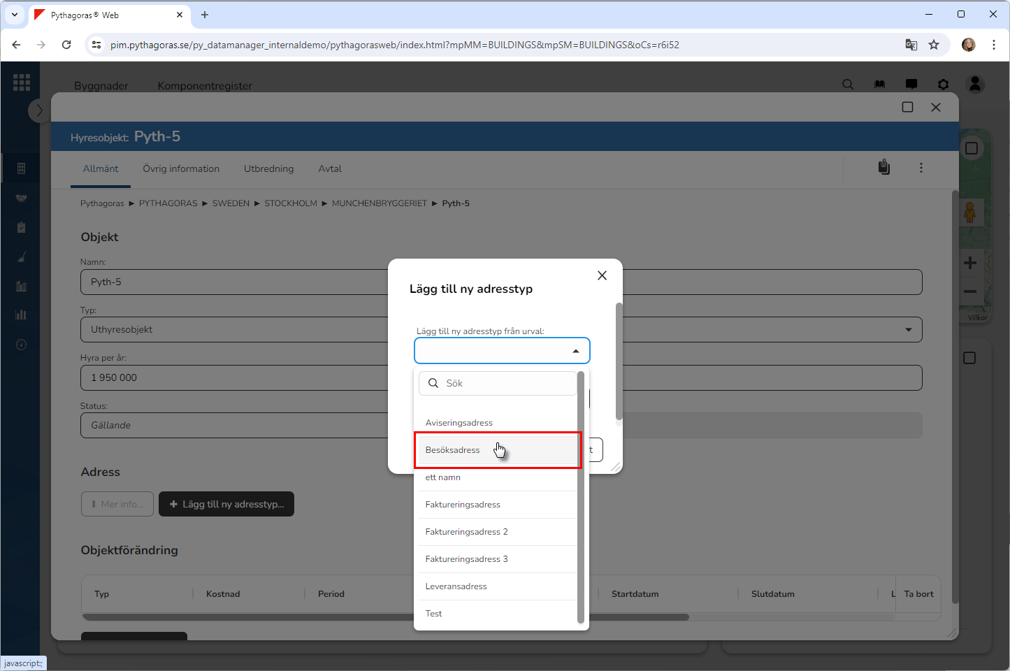 Ange vilken typ av adress du vill koppla till det hyresobjekt du arbetar med. Detta genom att