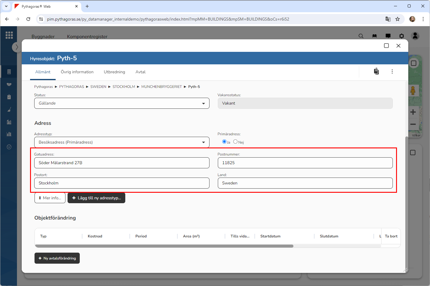 Sätt en gatuadress, ett postnummer, en postort och ett land på den adress du har kopplat till det hyresobjekt du arbetar med (se bilden nedan). Detta via fälten med namnen "Gatuadress", "Postnummer", "Postort" och "Land".