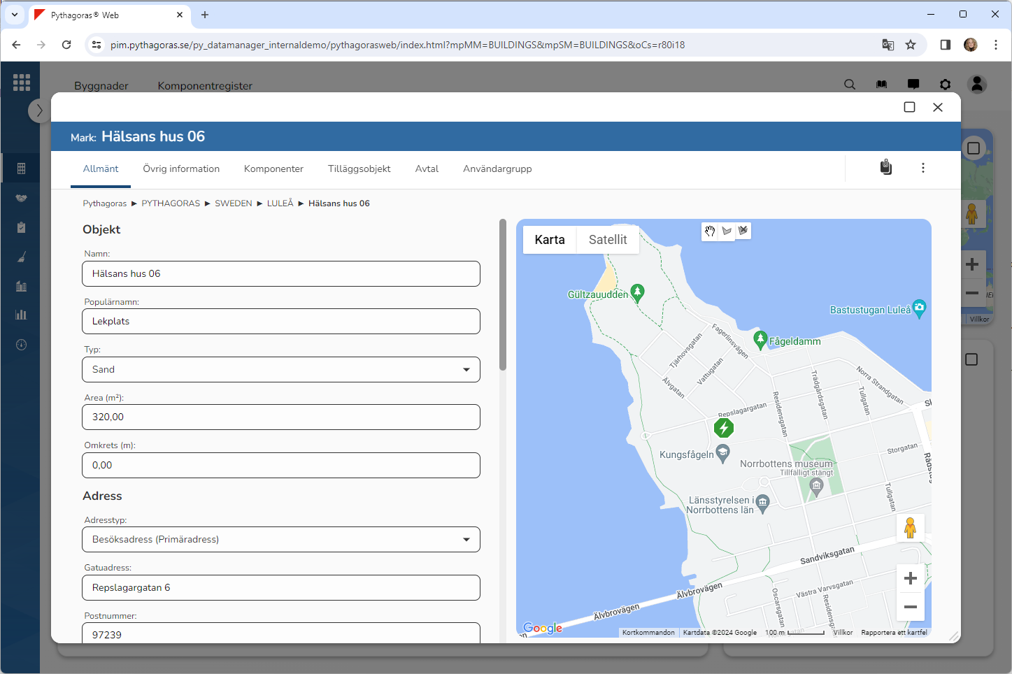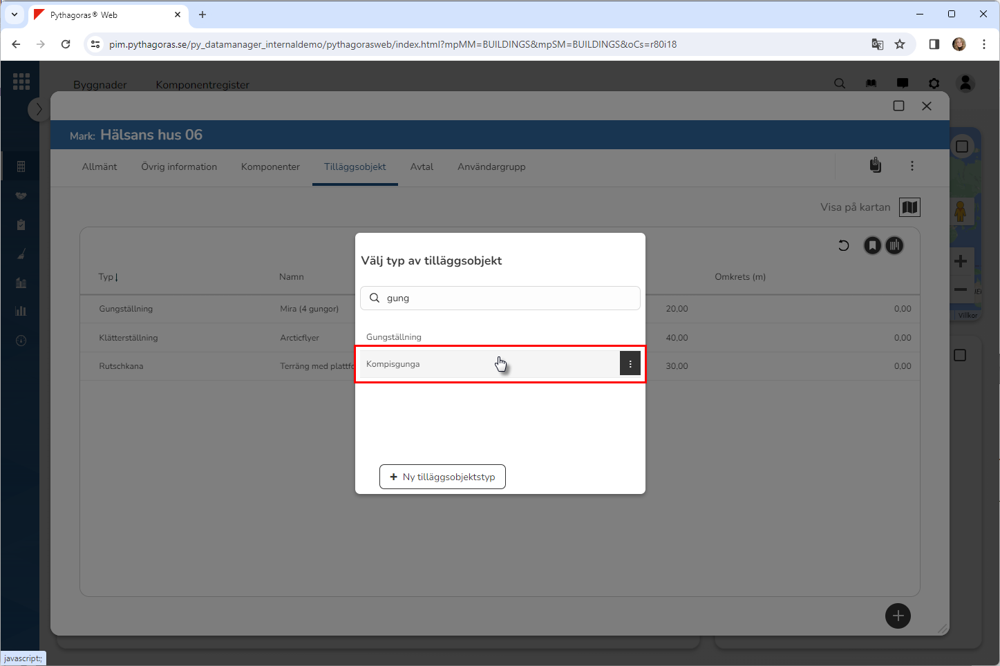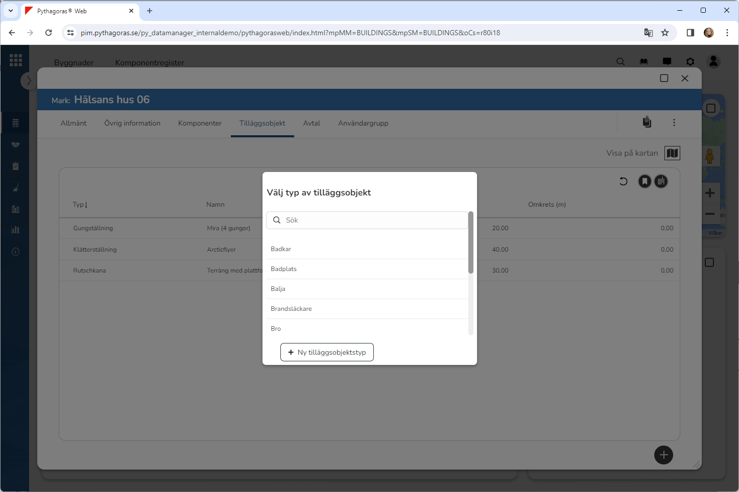 Ange vilken typ av tilläggsobjekt du vill koppla till det markobjekt du arbetar med. Detta genom att klicka på en tilläggsobjektstyp i listan med namnet "Välj typ av tilläggsobjekt" (se den första bilden nedan). När du klickar på en typ i listan med namnet "Välj typ av tilläggsobjekt" kommer ett tilläggsobjekt av den typ du har valt att skapas och kopplas till det markobjekt du arbetar med. När ett tilläggsobjekt har skapats får du tillgång till dess objektkort (se den andra bilden nedan). Via objektkortet kan du arbeta med inställningarna för ett tilläggsobjekt. För mer information om hur du arbetar med inställningarna för ett tilläggsobjekt, se avsnitt 10.6.3. Obs! Om du saknar en typ i listan med namnet "Välj typ av tilläggsobjekt" kan du lägga till en tilläggsobjektstyp i Pythagoras webb. Detta genom att klicka på knappen med namnet "Ny tilläggsobjektstyp". För mer information om hur du lägger till en tilläggsobjektstyp i Pythagoras webb, se avsnittet med namnet "Lägg till en tilläggsobjektstyp i Pythagoras webb".