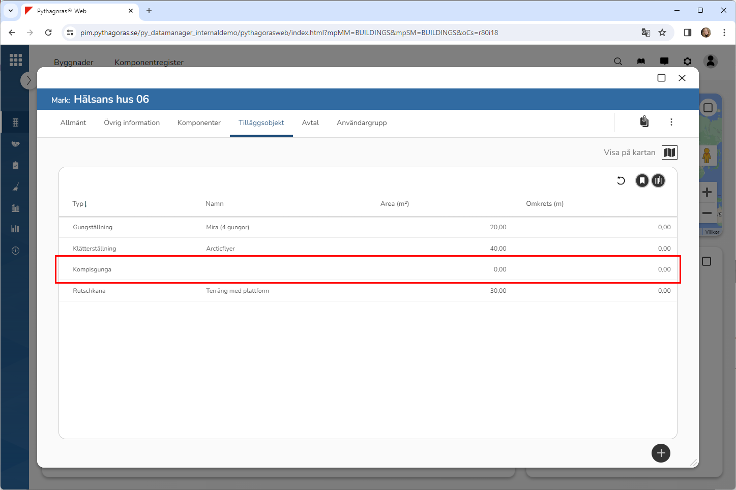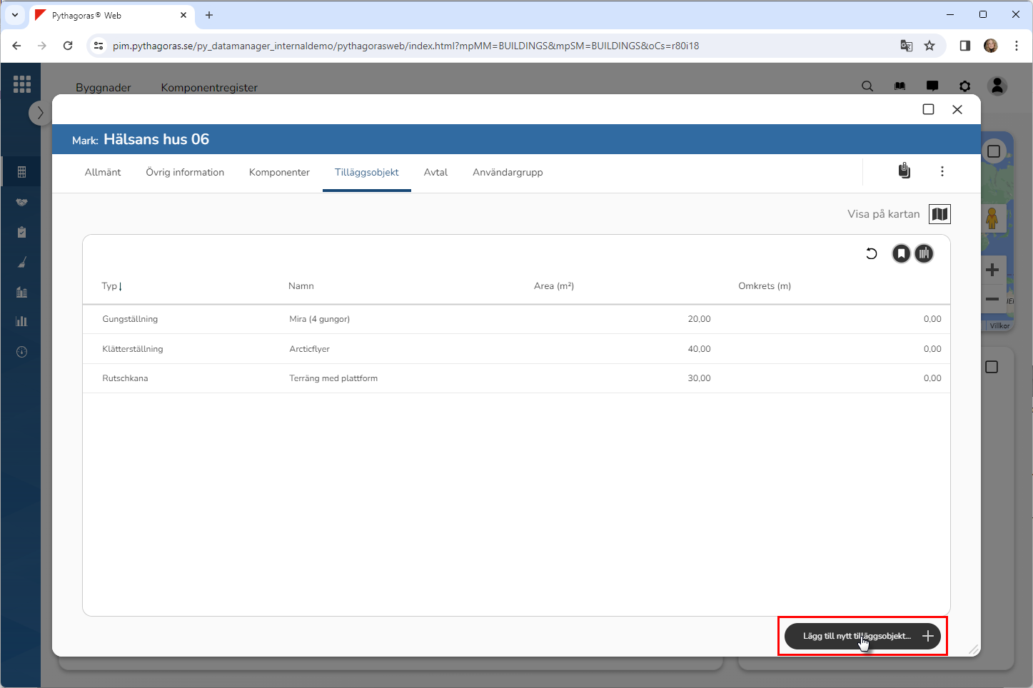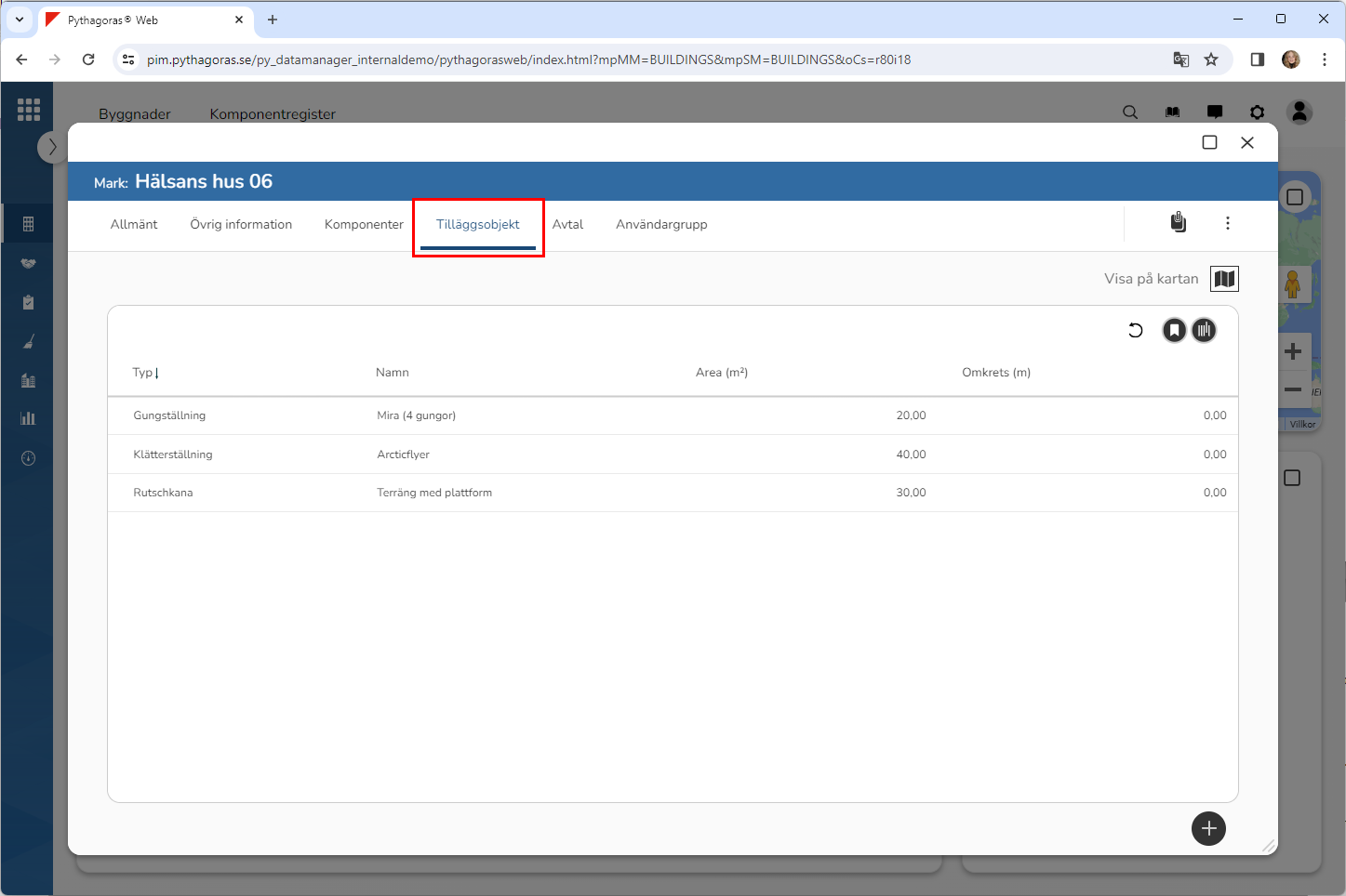 Ställ dig på fliken med namnet "Tilläggsobjekt" (se bilden nedan). Under fliken med namnet "Tilläggsobjekt" hittar du en lista med tilläggsobjekt som är kopplade till det markobjekt du arbetar med.