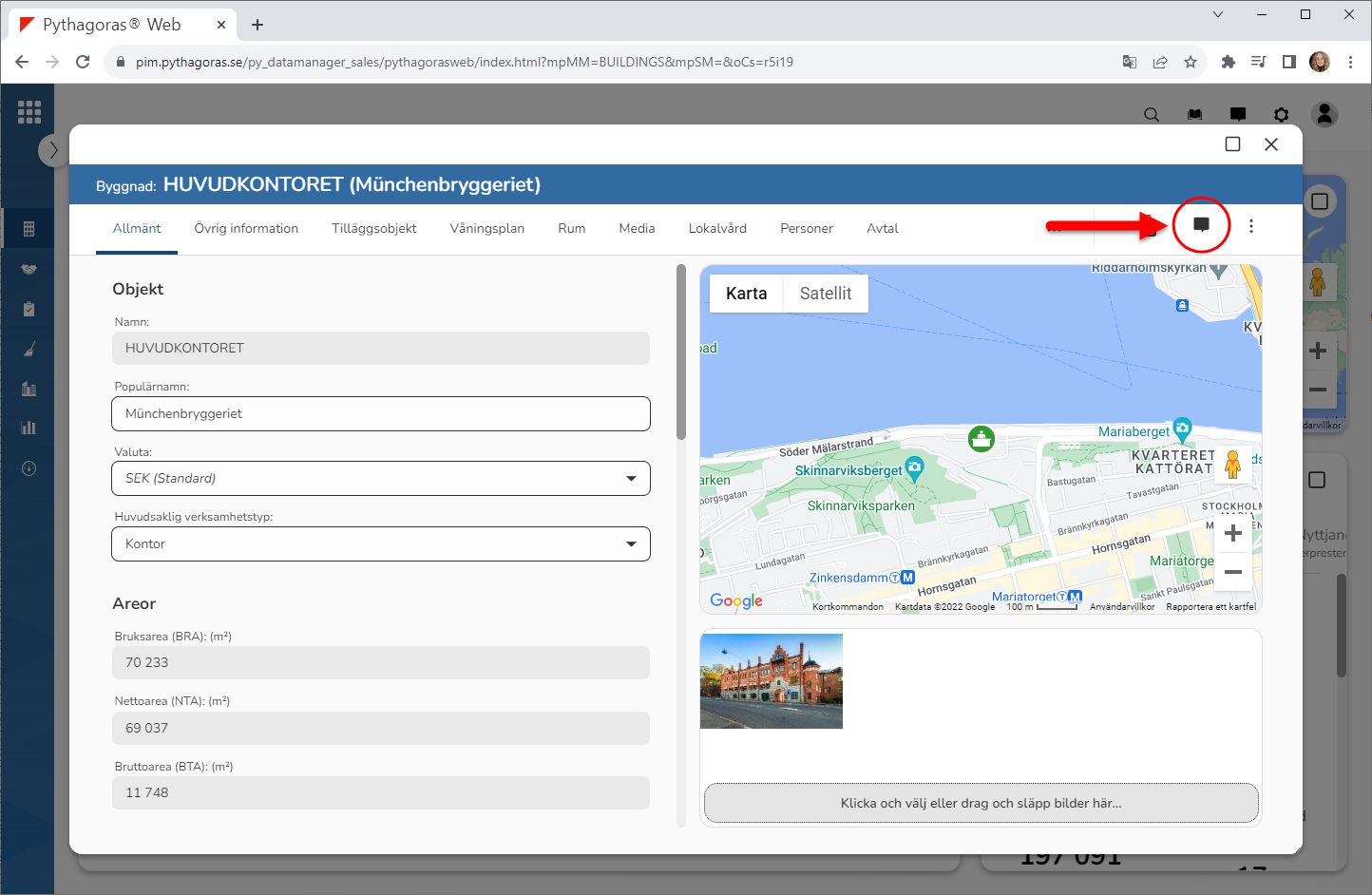 Öppna den byggnad du vill lägga till en kommentar på. För mer information om hur du öppnar en byggnad, se avsnitt 4.6.1., 5.4.3. eller 6.1.1.