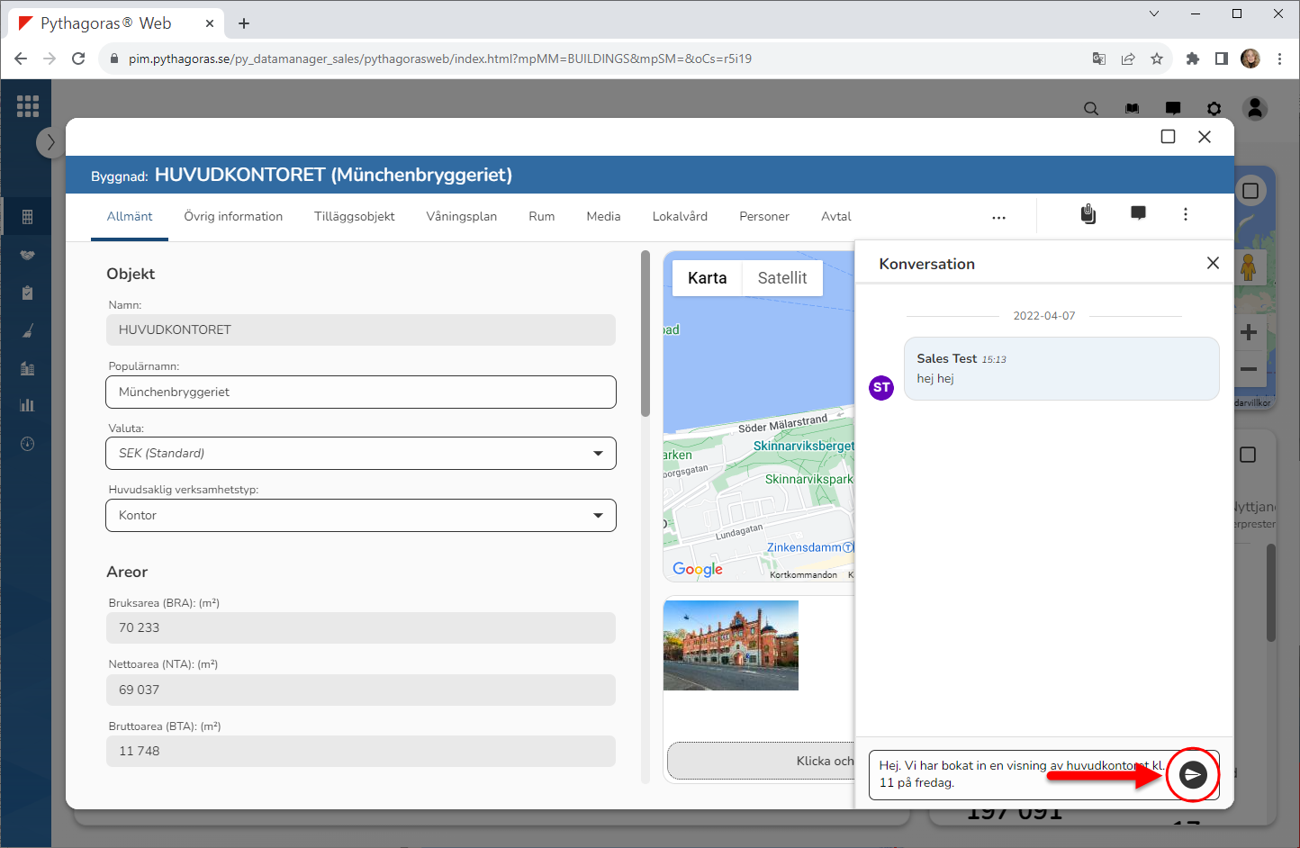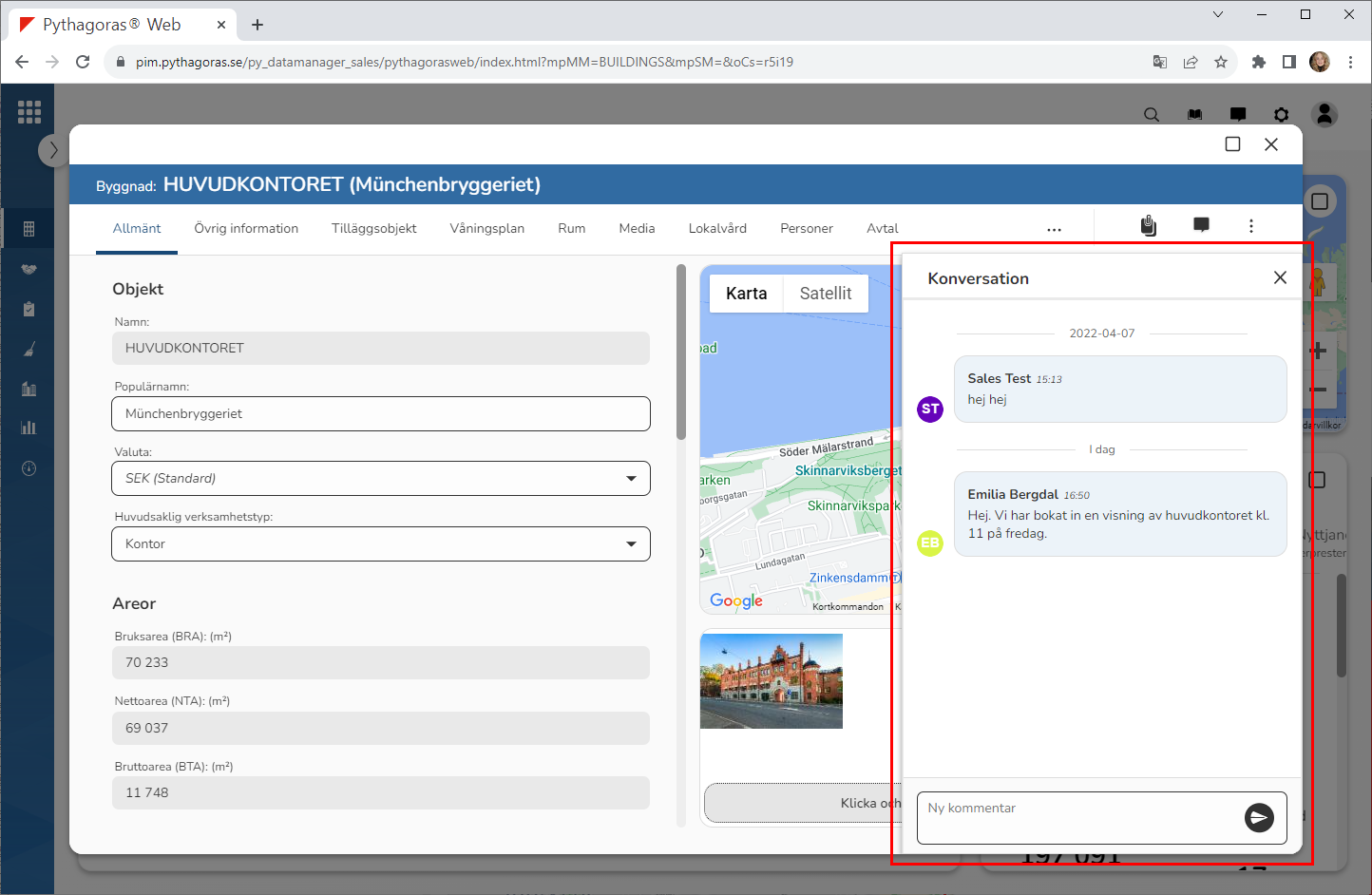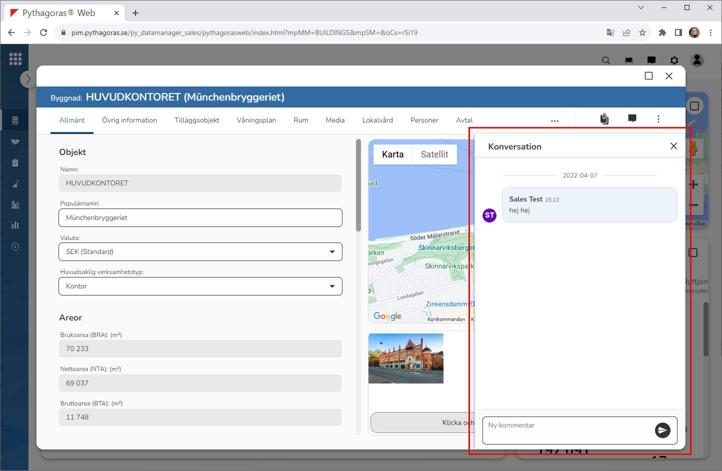 Klicka "Skicka" (se den första bilden nedan). När du klickar "Skicka" kommer en kommentar med den text du har angett i fältet med namnet "Ny kommentar" läggas till på den byggnad du arbetar med (se den andra bilden nedan).