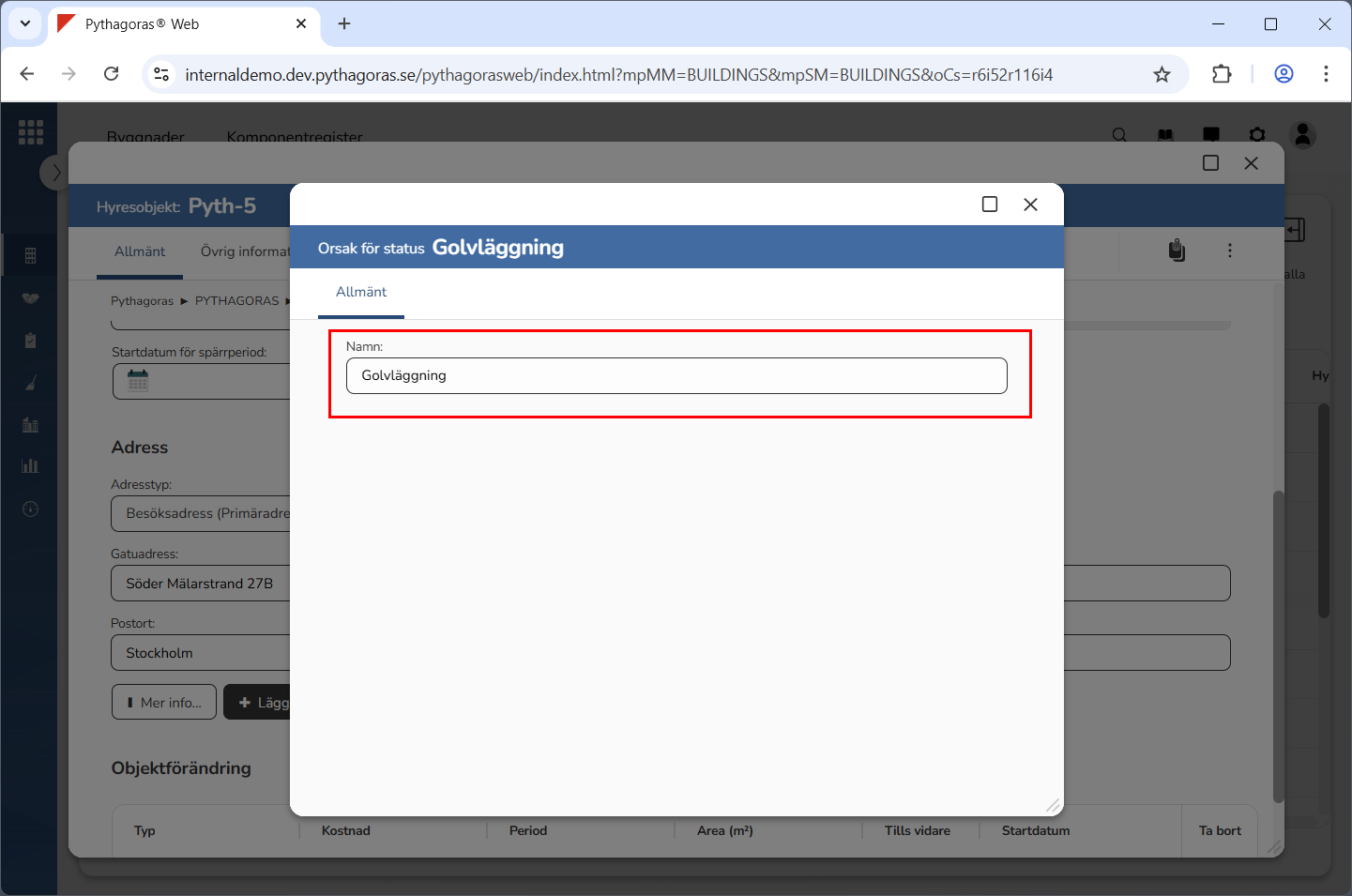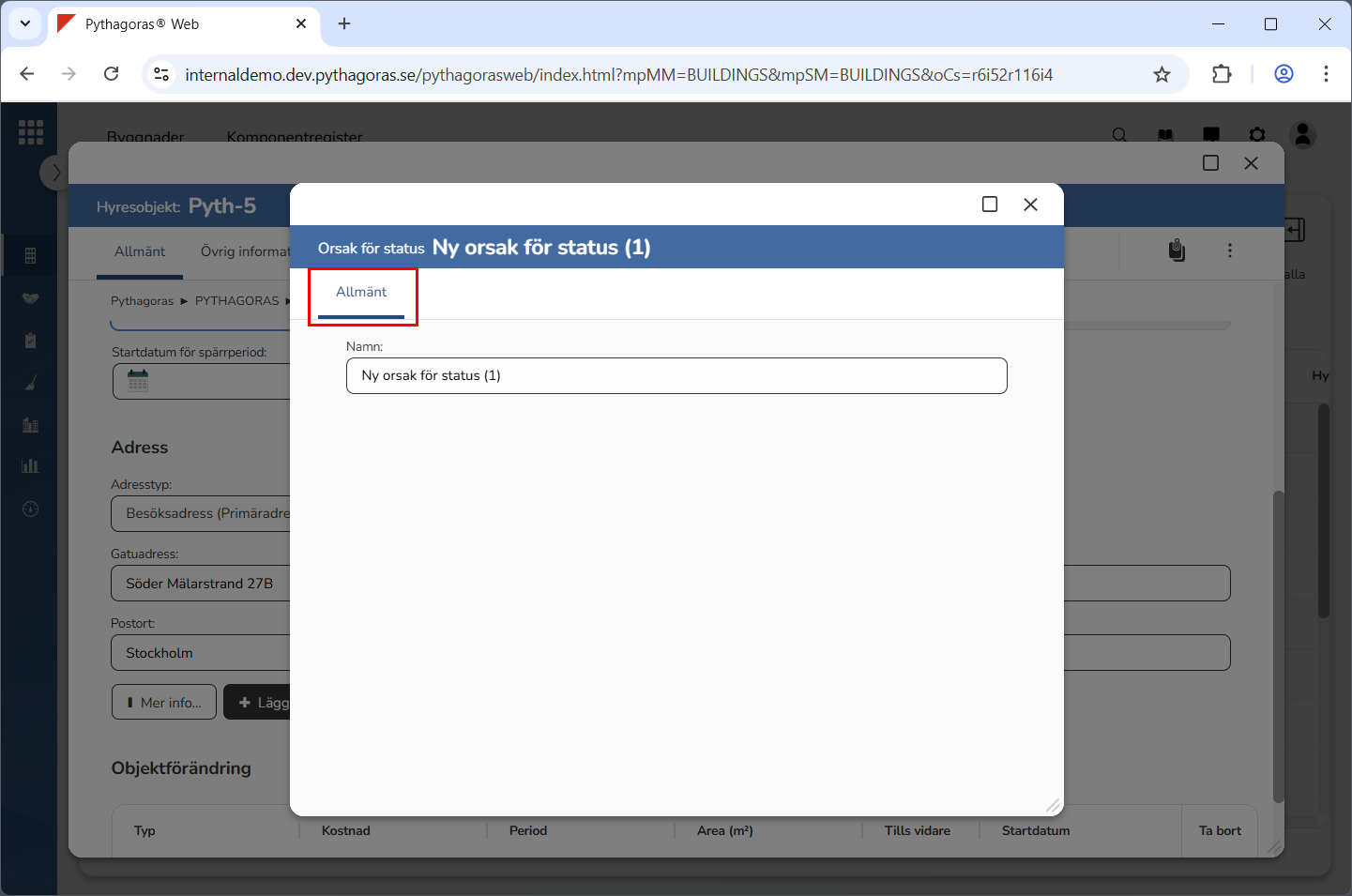Stäng orsakskortet (se den första bilden nedan). När du stänger orsakskortet skickas du tillbaka till hyresobjektskortet (se den andra bilden nedan).