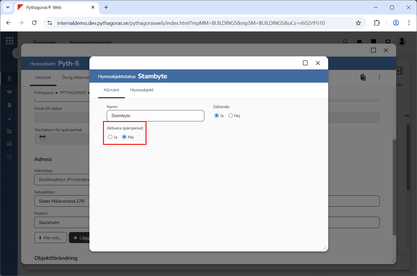 Ange om den status du har lagt till i Pythagoras webb ska aktivera spärrperiodsfunktionen eller inte (se bilden nedan). Kryssa "Ja" eller "Nej" under etiketten "Aktivera spärrperiod".