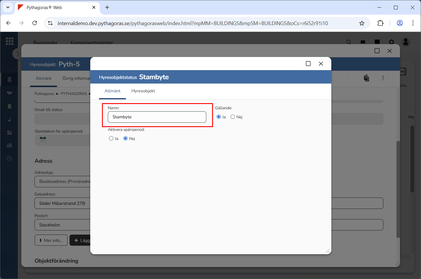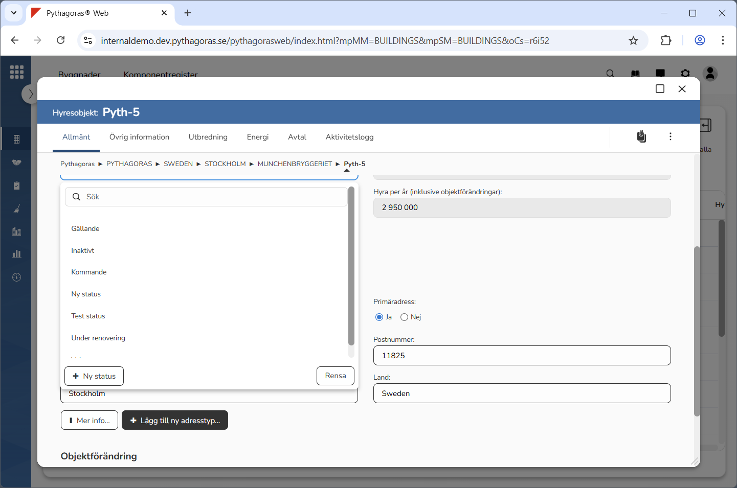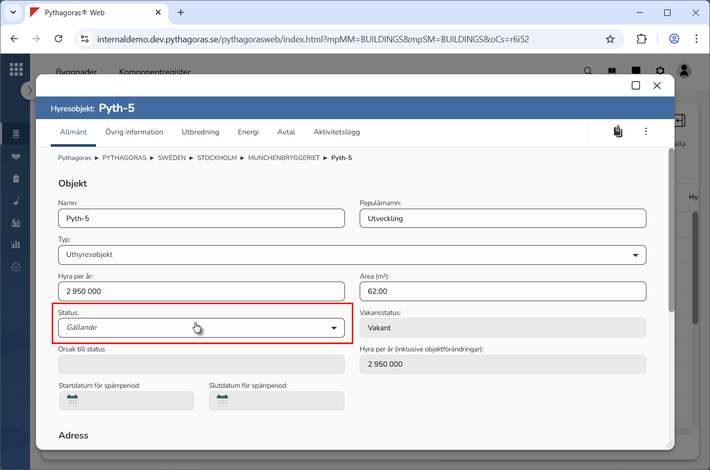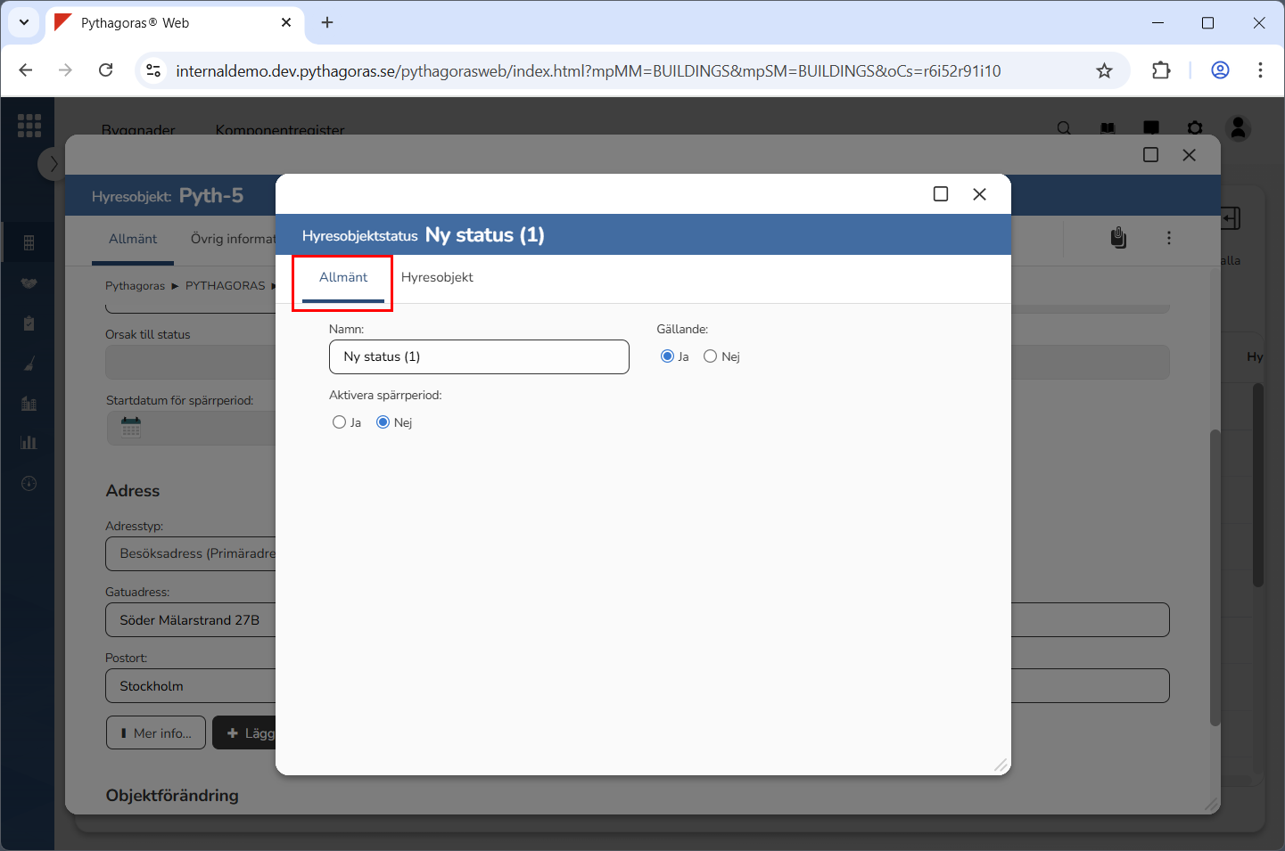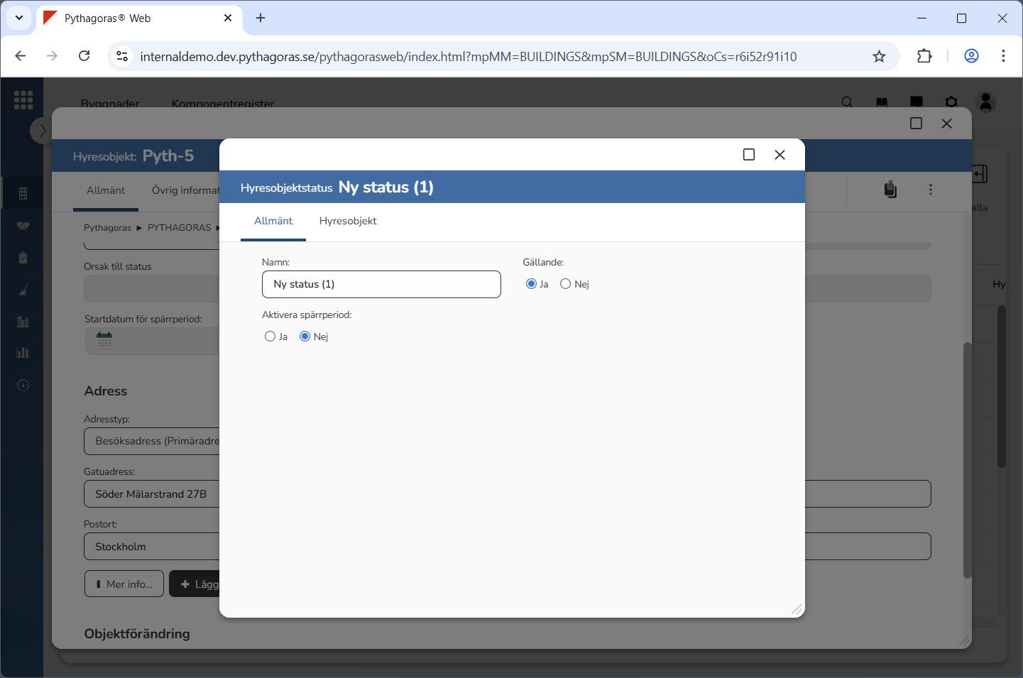 Stäng statuskortet (se den första bilden nedan). När du stänger statuskortet skickas du tillbaka till hyresobjektskortet (se den andra bilden nedan).