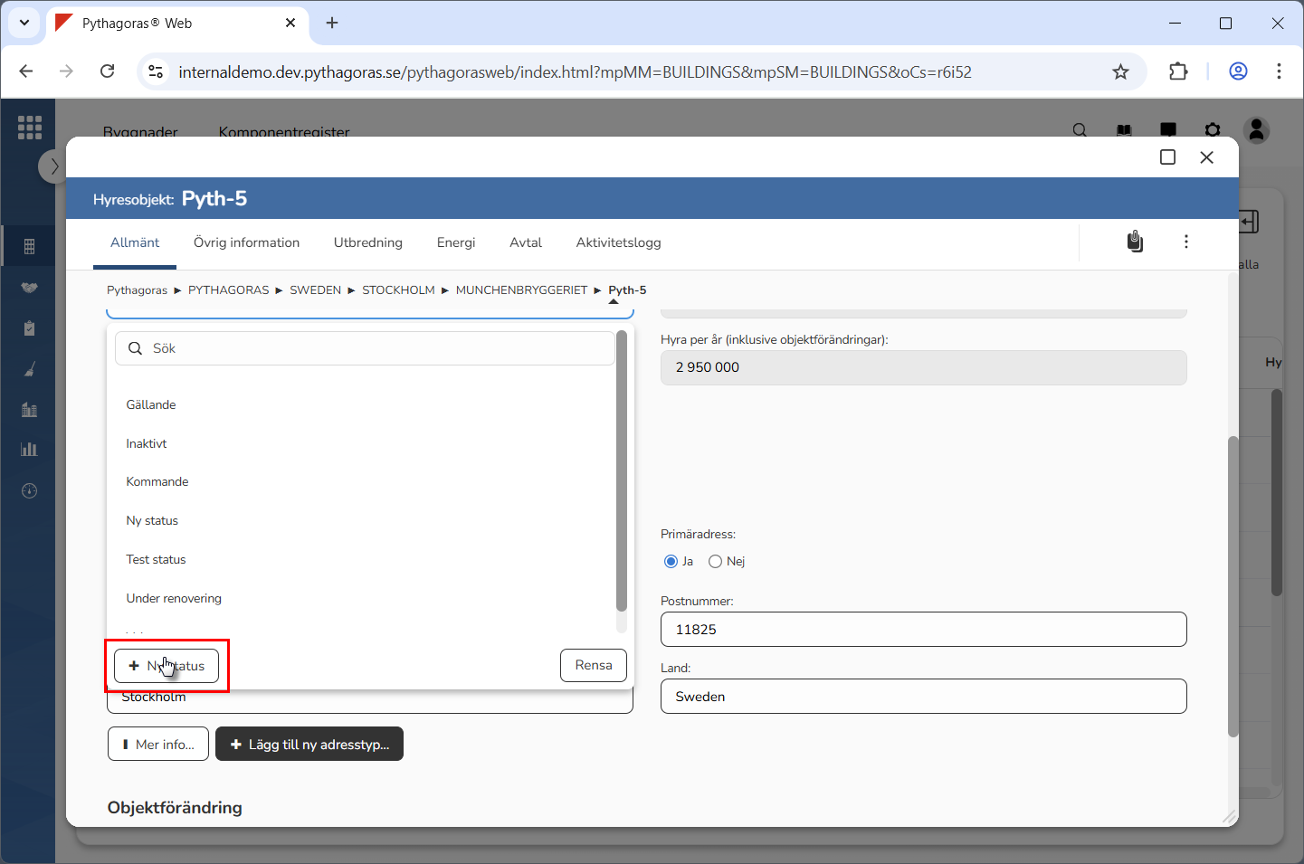 Klicka på knappen med namnet "Ny status" (se den första bilden nedan). När du klickar på knappen med namnet "Ny status" kommer en ny status att läggas till i Pythagoras webb. När en status har lagts till i Pythagoras webb får du tillgång till dess statuskort (se den andra bilden nedan).
