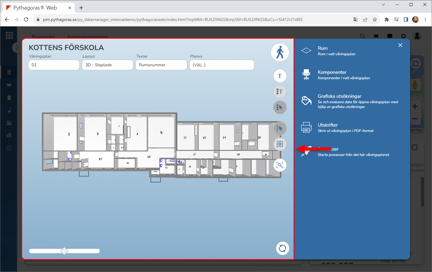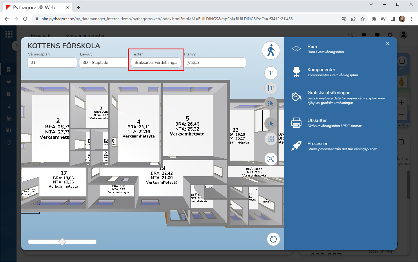 Lägg till en eller fler rumstexter i modellen (se bilden nedan). Detta genom att placera din muspekare i fältet med namnet "Texter" och sedan välja en eller fler rumstexter i den lista du får tillgång till.