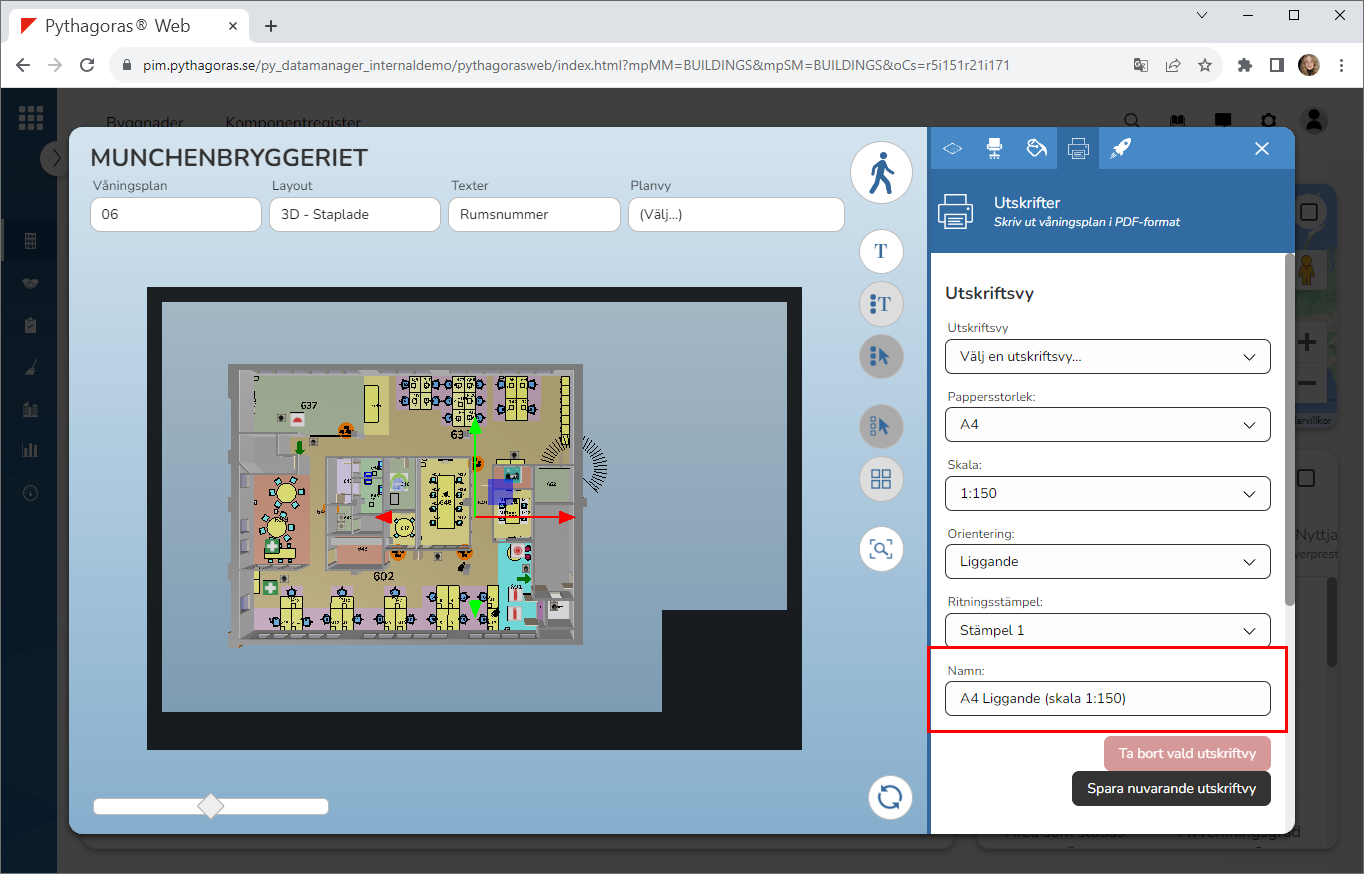 Via fältet med namnet "Namn" kan du sätta ett namn på en utskriftsvy medan du håller på att skapa den (se bilden nedan). För mer information om hur du skapar en utskriftsvy, se avsnitt 9.16.3.