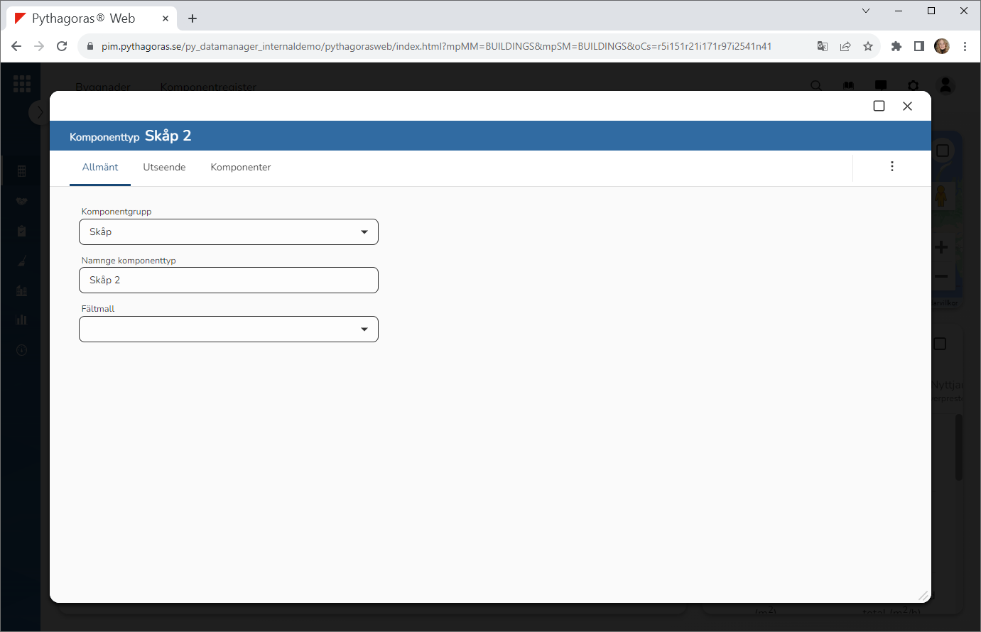 Klicka på ikonen med namnet "Öppna komponenttypsdefinitionen" (se den första bilden nedan). När du klickar på ikonen med namnet "Öppna komponenttypsdefinitionen" kommer den komponenttyp du arbetar med att öppnas. När en komponenttyp öppnas får du tillgång till dess komponenttypskort (se den andra bilden nedan).