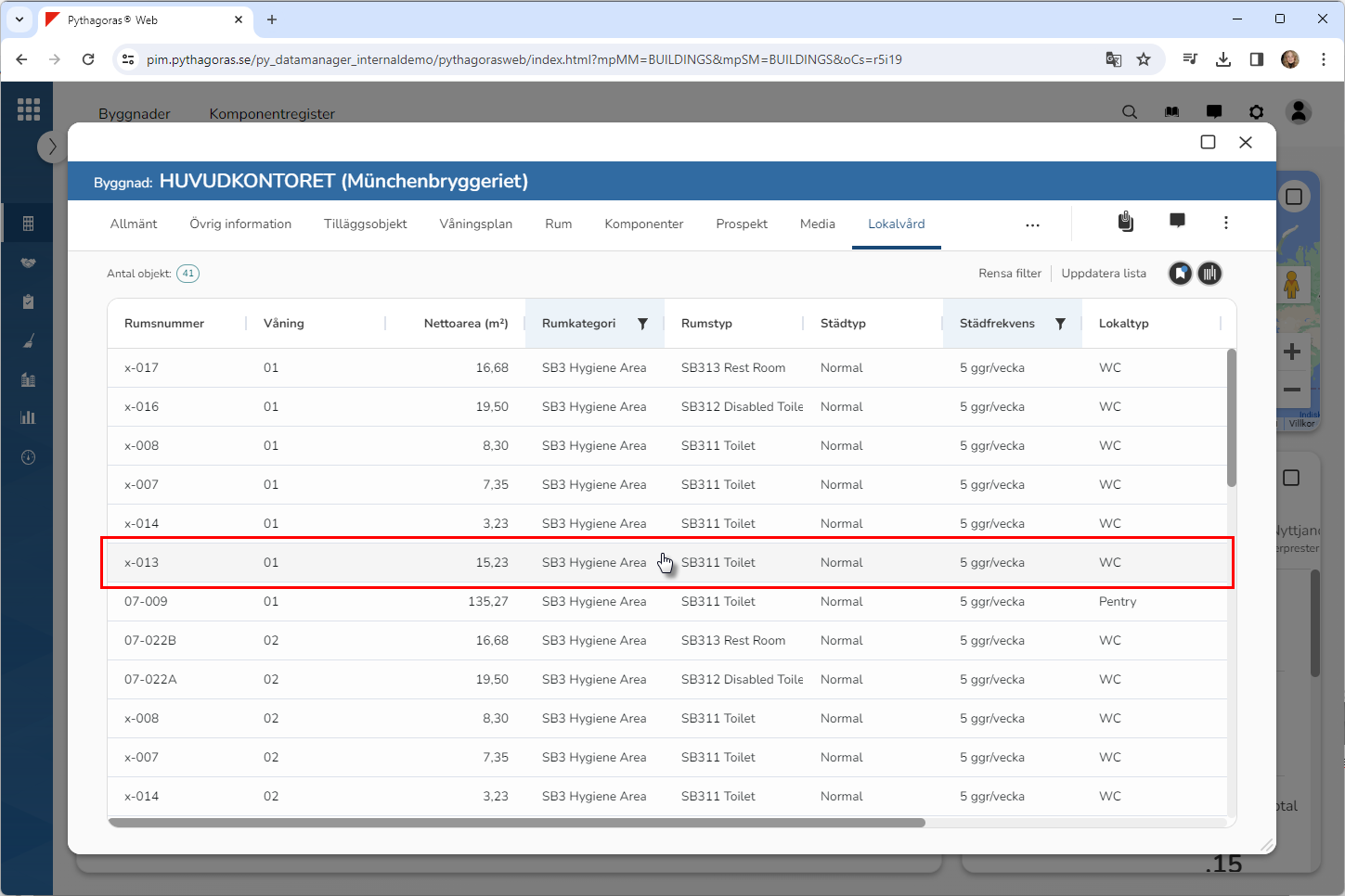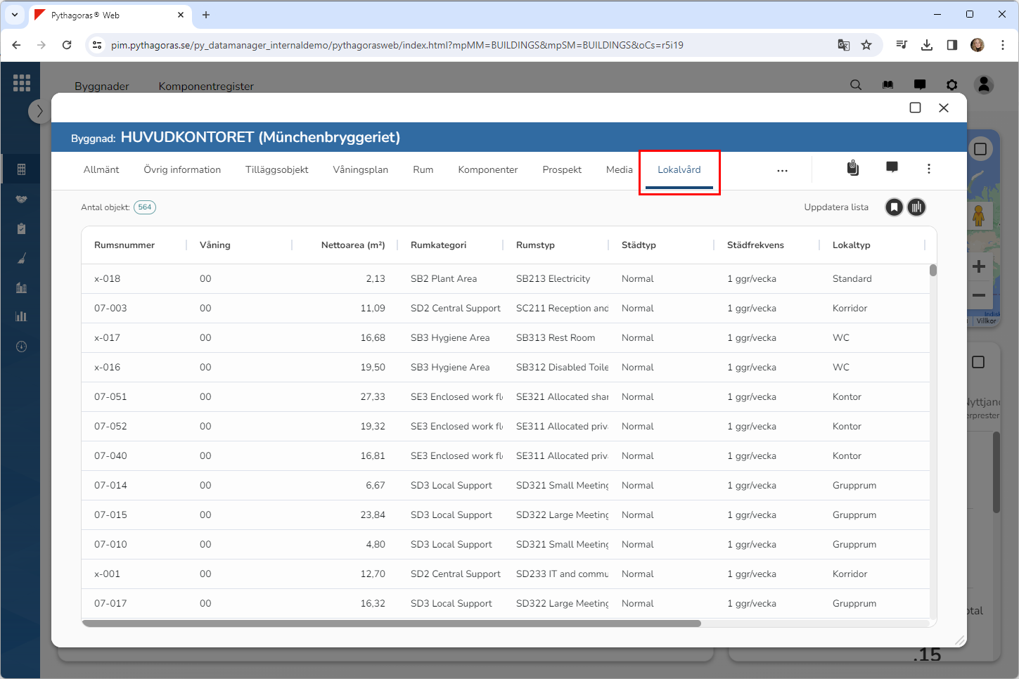 Ställ dig på fliken med namnet "Lokalvård" (se bilden nedan). Under fliken med namnet "Lokalvård" hittar du en rumslista. I rumslistan ser du vilka rum som är tillgängliga i den byggnad du arbetar med.
