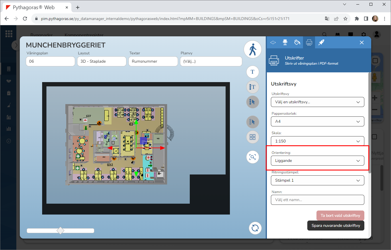 Via fältet med namnet "Orientering" kan du sätta en pappersorientering på en utskrift eller en utskriftsvy (se bilden nedan).
