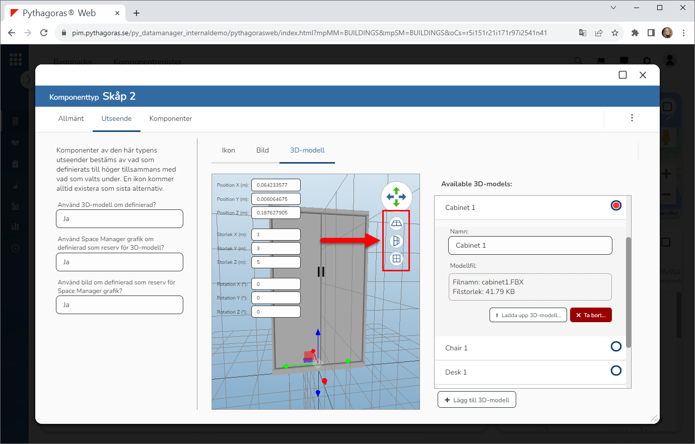 Flytta, rotera och ändra skala/storlek på 3D-modellen. Detta genom att