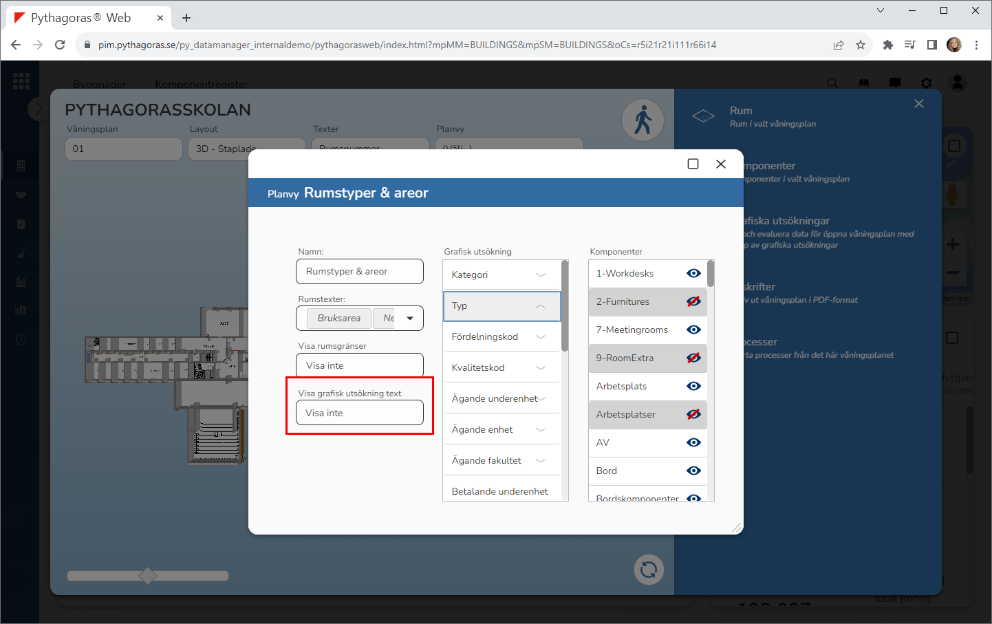 Lägg till eller ta bort värdenamn från den planvy du arbetar med (se bilden nedan). Detta genom att klicka i fältet med namnet "Visa grafisk utsökningstext" och sedan föra det reglage du hittar i fönstret med namnet "Välj om grafisk utsökning ska visas" till "Visa" eller "Visa inte".