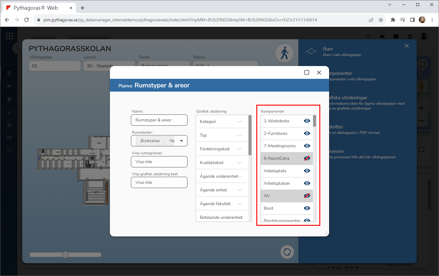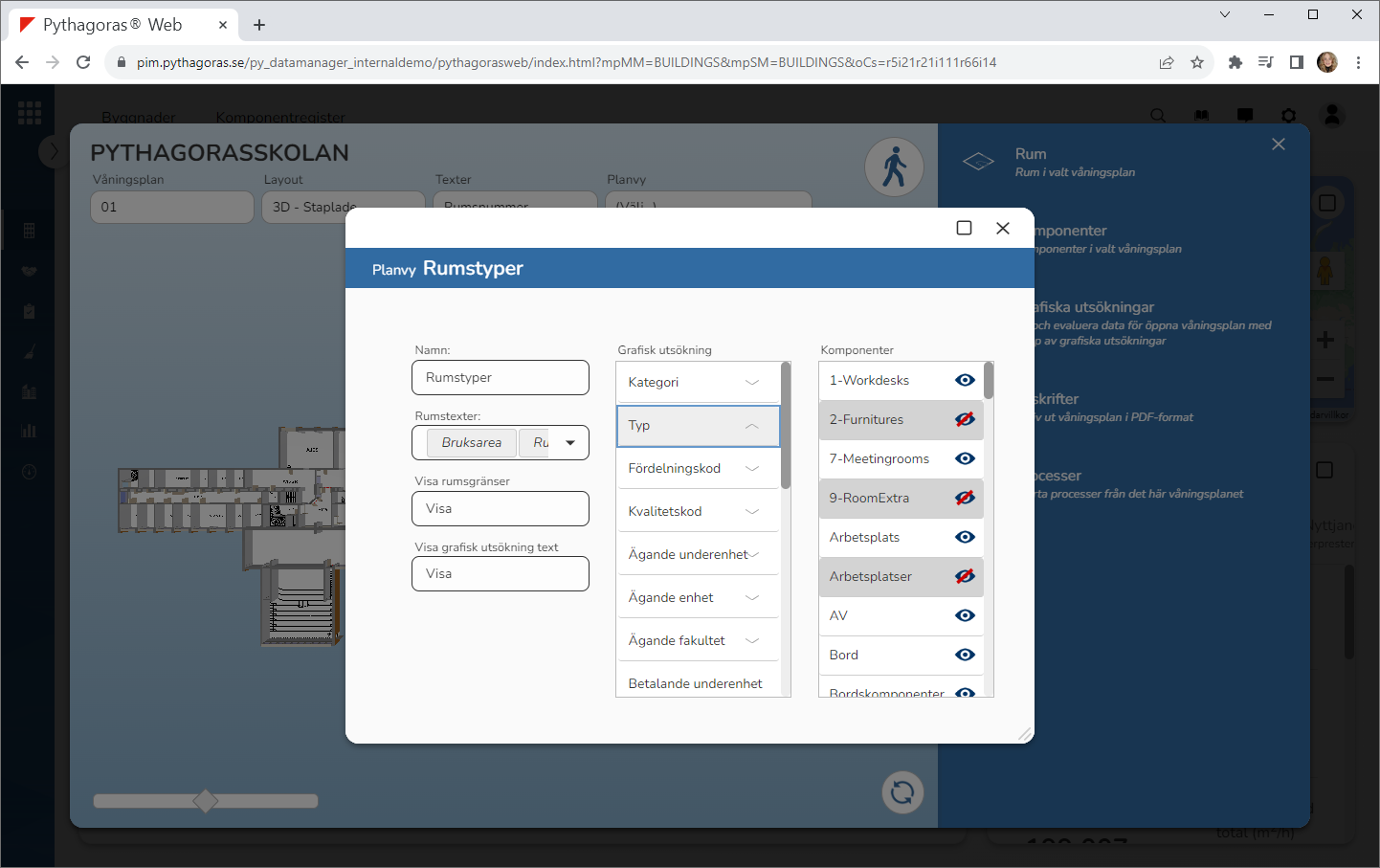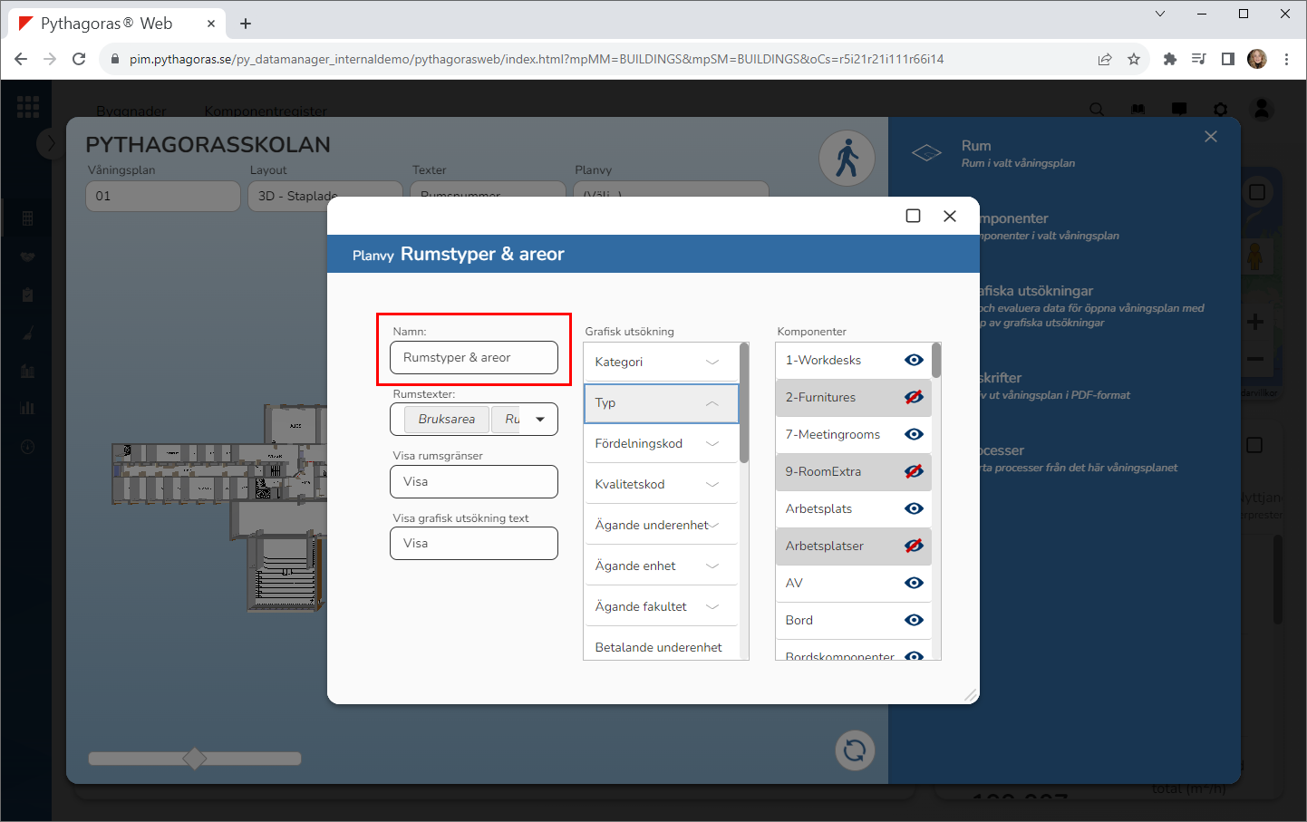 Placera din muspekare i fältet med namnet "Planvy" (se den första bilden nedan). När du placerar din muspekare i fältet med namnet "Planvy" får du tillgång till en lista med planvyer som är tillgängliga i Pythagoras webb (se den andra bilden nedan).