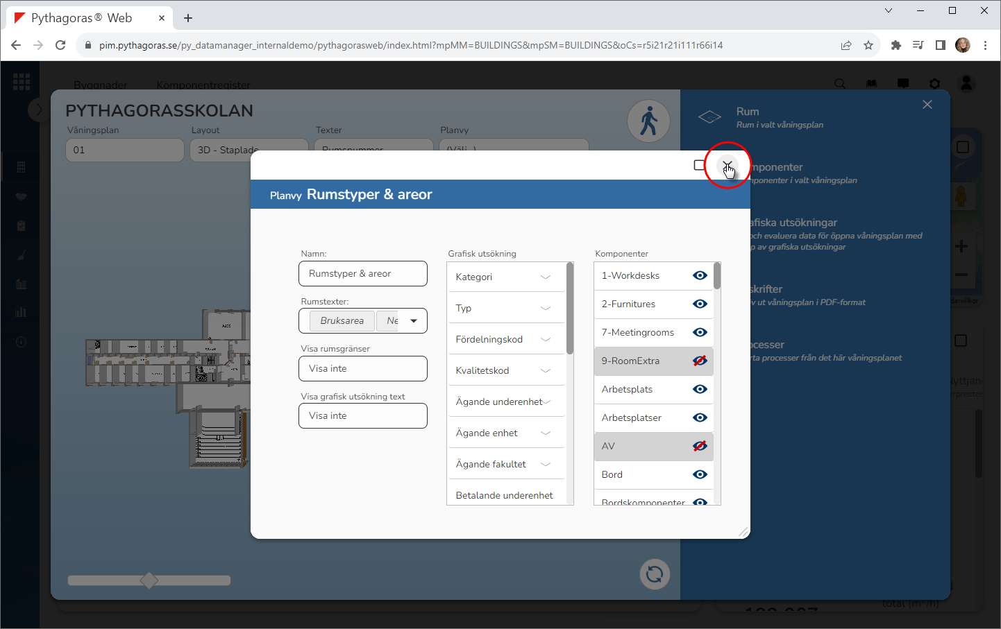 Stäng vy-kortet (se den första bilden nedan). När du stänger vy-kortet skickas du tillbaka till våningsplanskortet (se den andra bilden nedan).