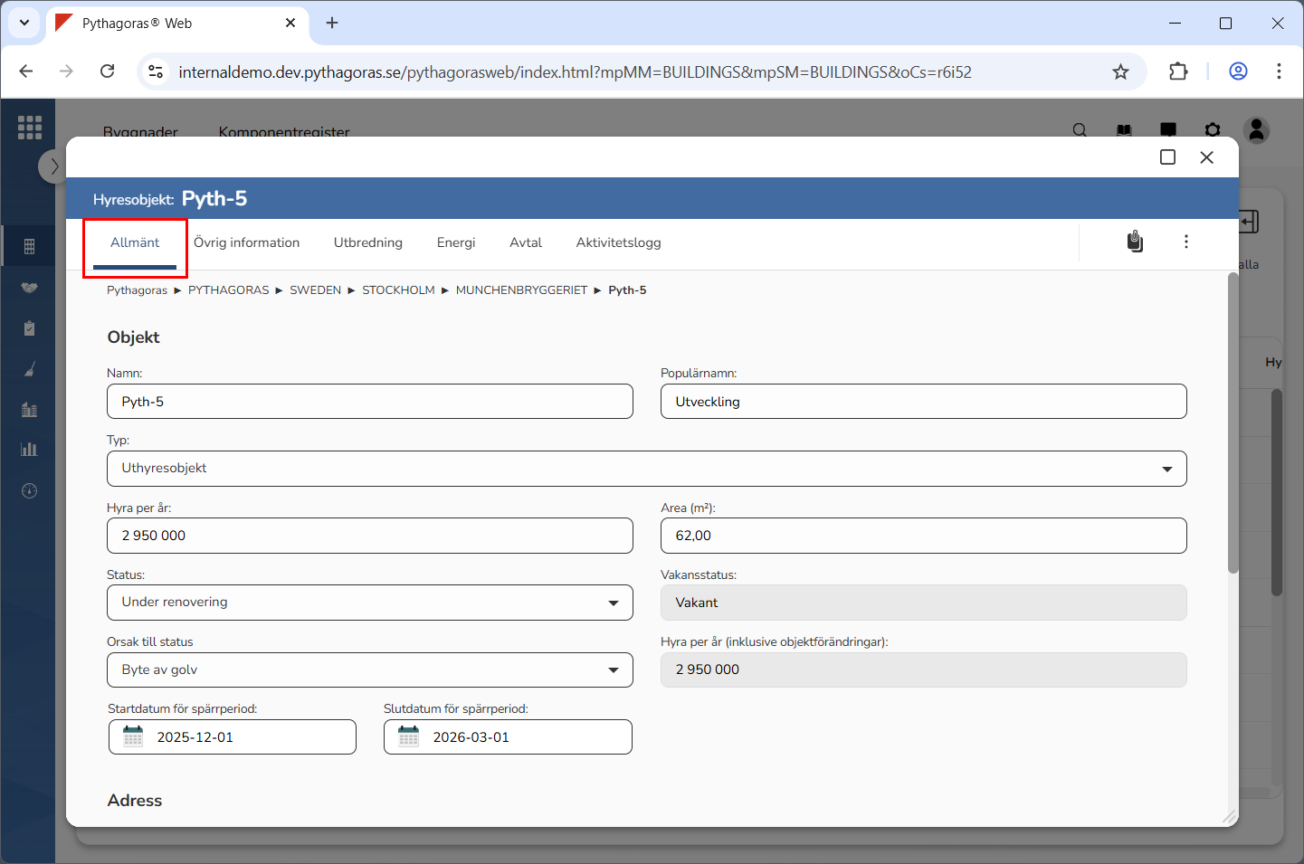 Öppna det hyresobjekt du vill arbeta med. För mer information om hur du öppnar ett hyresobjekt, se avsnitt 11.1.