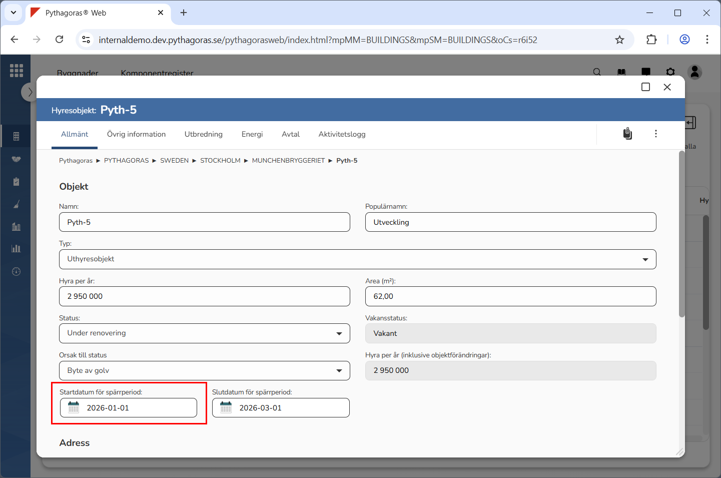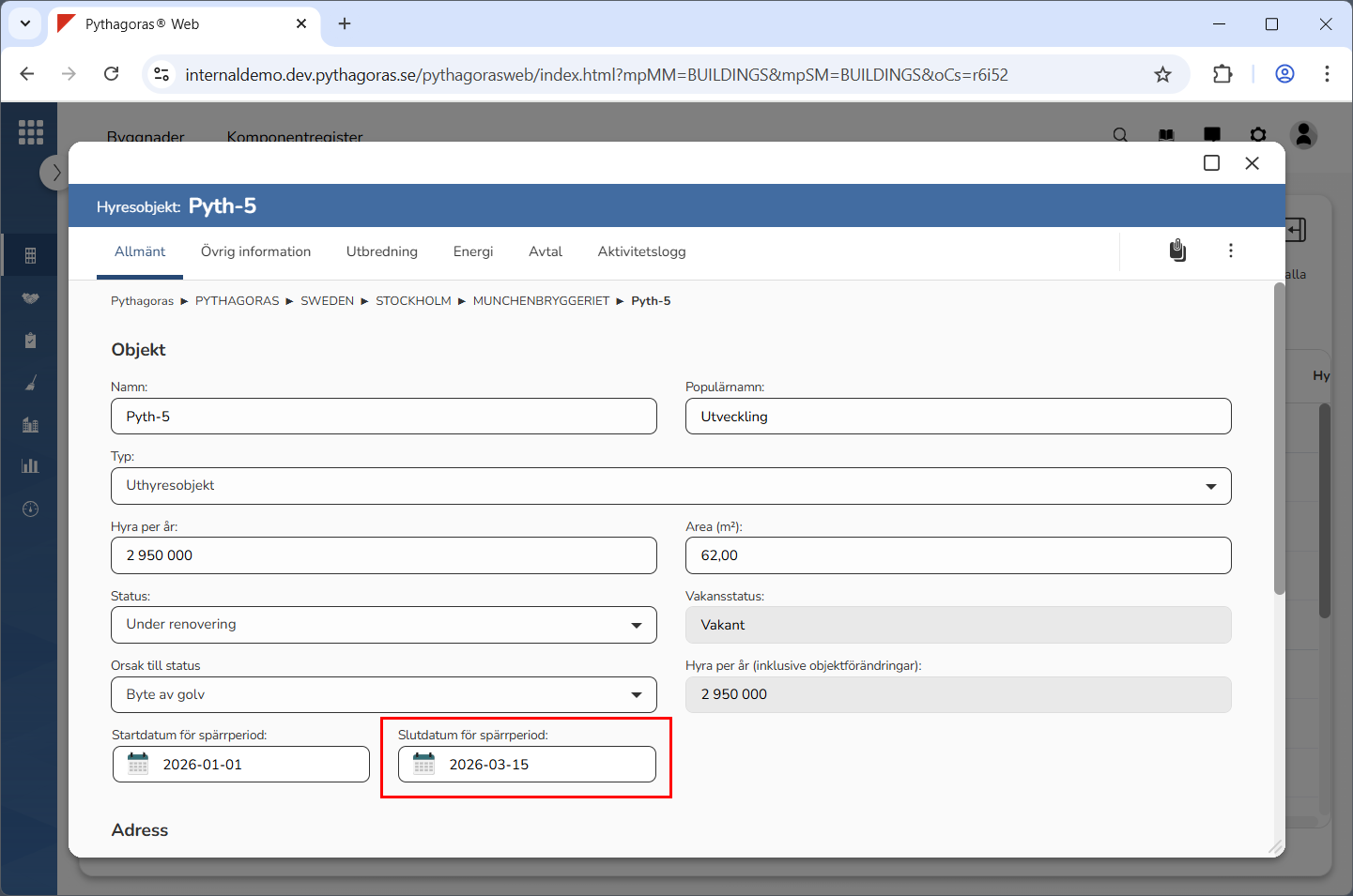 För att redigera en spärrperiod för ett hyresobjekt, gör du så här: