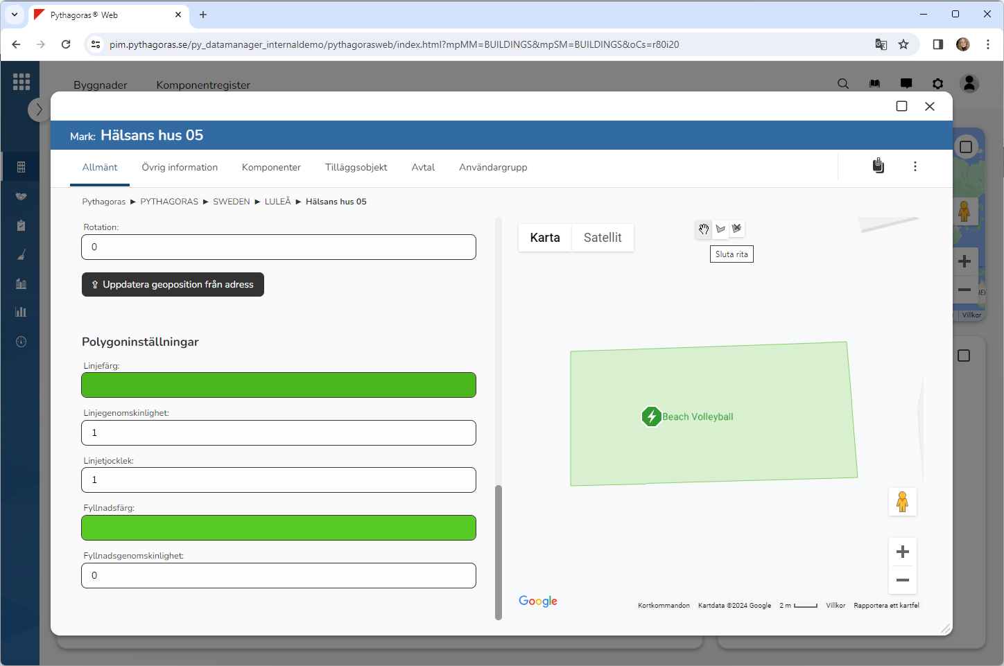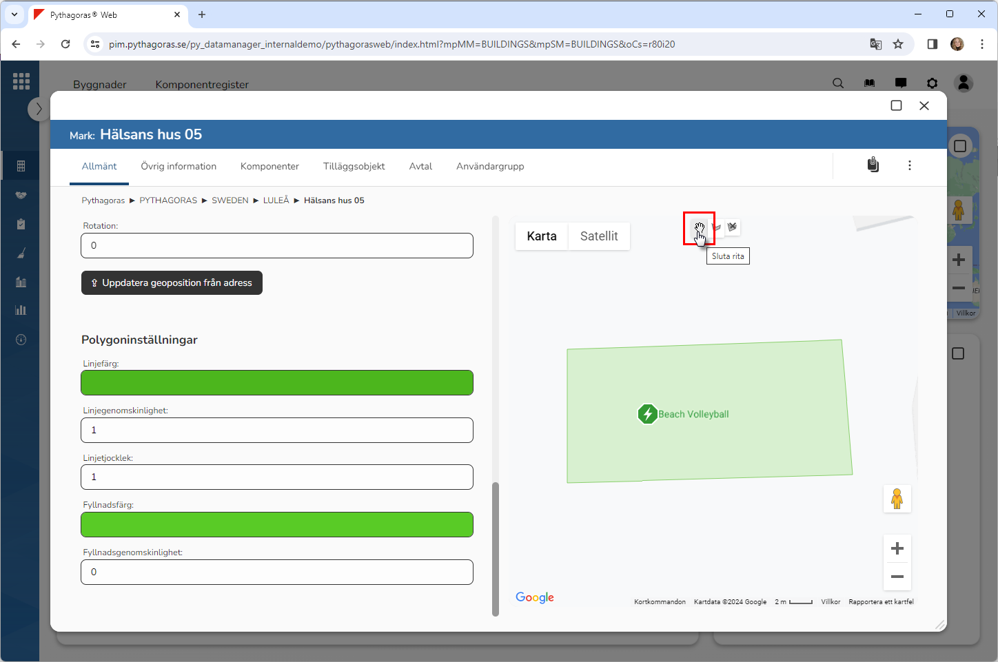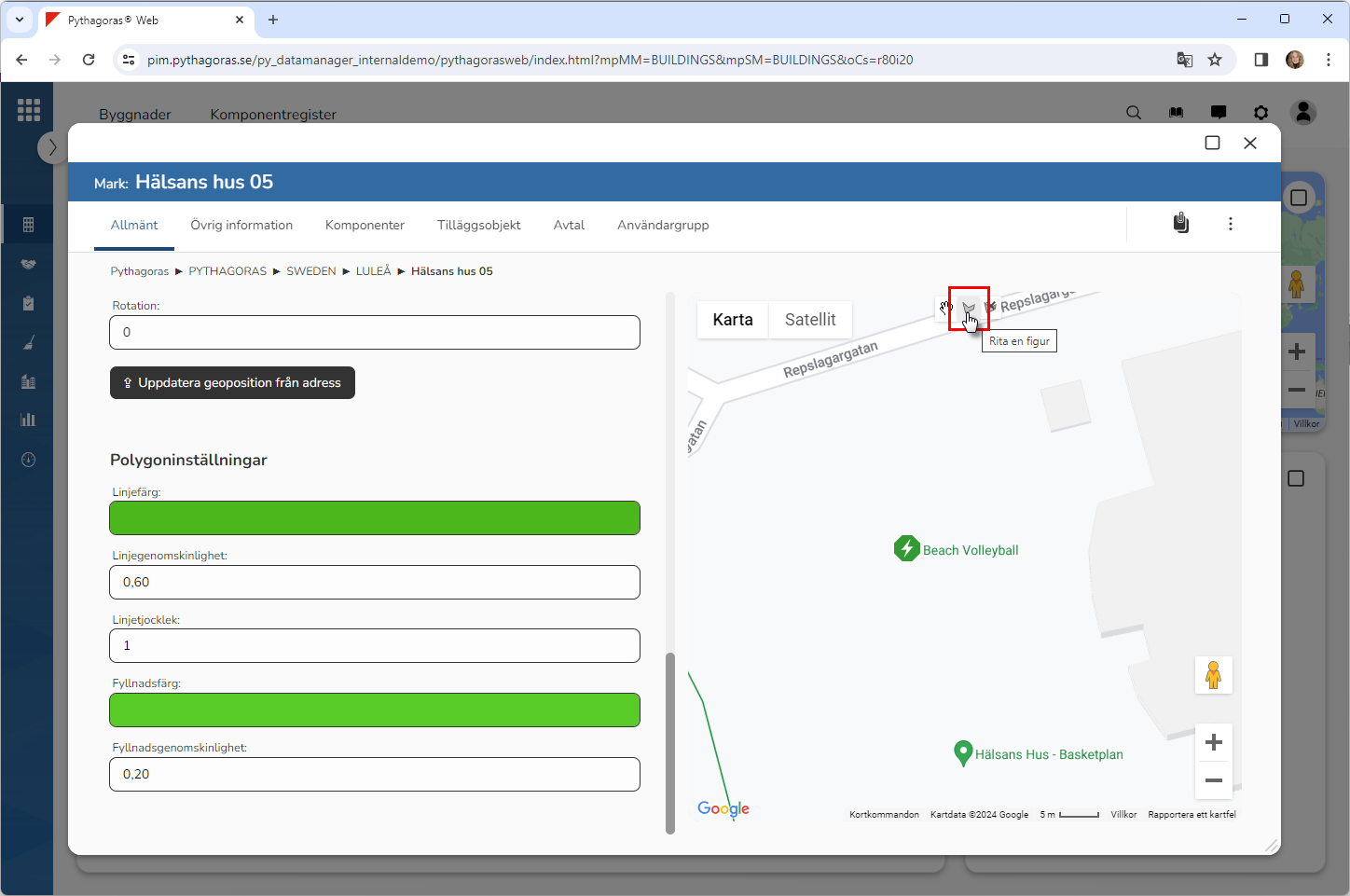 Genom att rita in en polygon på kartan kan du visa utbredningen för ett markobjekt på den. När du ritar in en polygon på kartan uppdateras arean och omkretsen för det markobjekt du arbetar med.