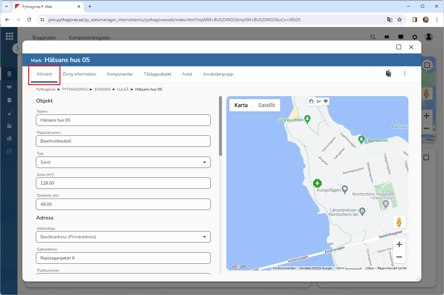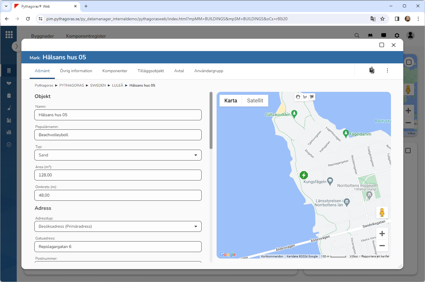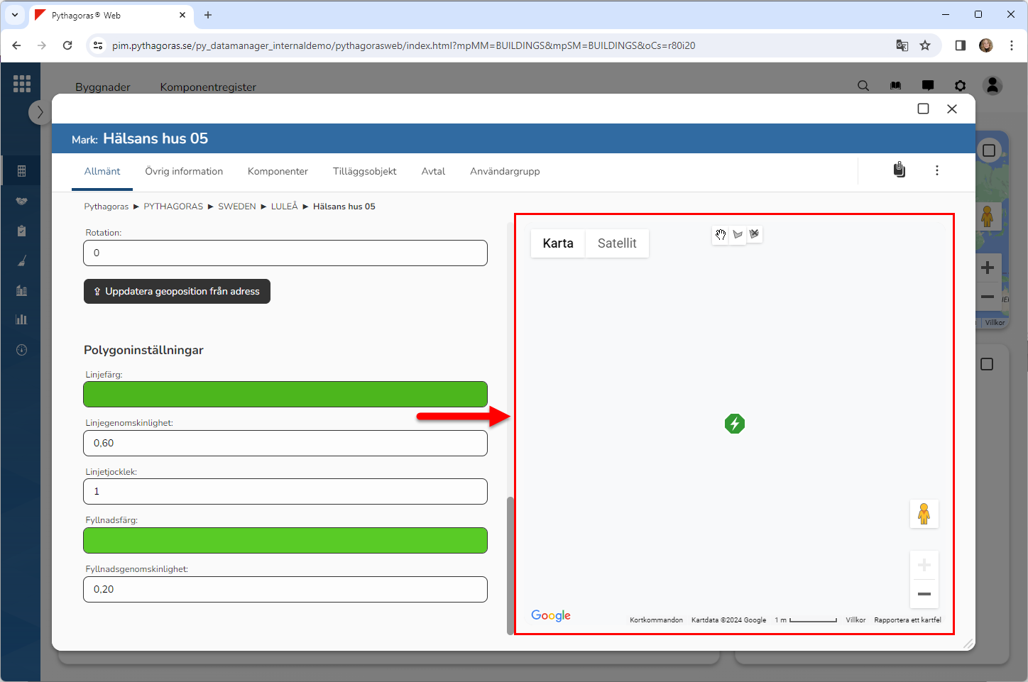 Genom att rita in en polygon på kartan kan du visa utbredningen för ett markobjekt på den. När du ritar in en polygon på kartan uppdateras arean och omkretsen för det markobjekt du arbetar med.