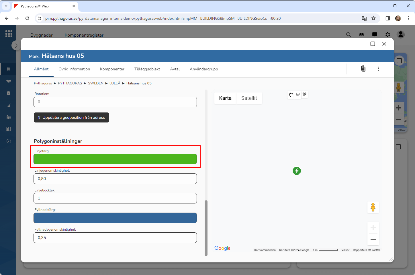 Sätt en linjefärg på den polygon du ska rita in på kartan (se bilden nedan). Detta genom att klicka i fältet med namnet "Linjefärg" och sedan välja en linjefärg i fönstret med namnet "Linjefärg". Obs! Detta behöver du bara göra om du vill att linjefärgen på den polygon du ska rita in på kartan ska vara en annan än den standardfärg som är satt på den.