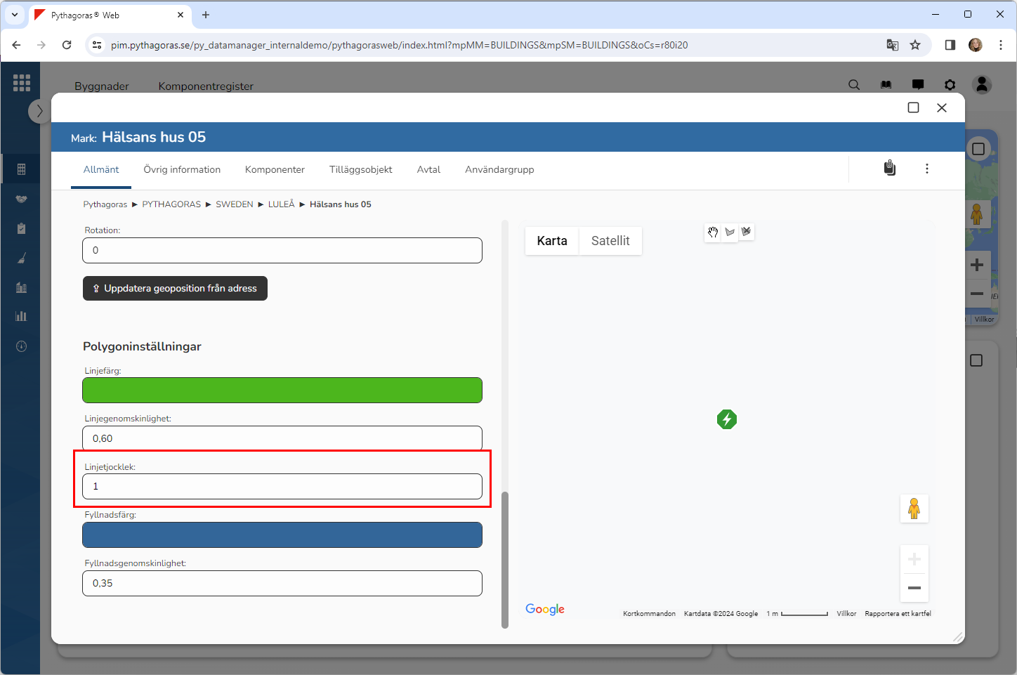 Ange hur tjocka linjerna på den polygon du ska rita in på kartan ska vara (se bilden nedan). Detta genom att ange en tjocklek i fältet med namnet "Linjetjocklek". Ju lägre linjetjocklek, desto tunnare blir linjerna.