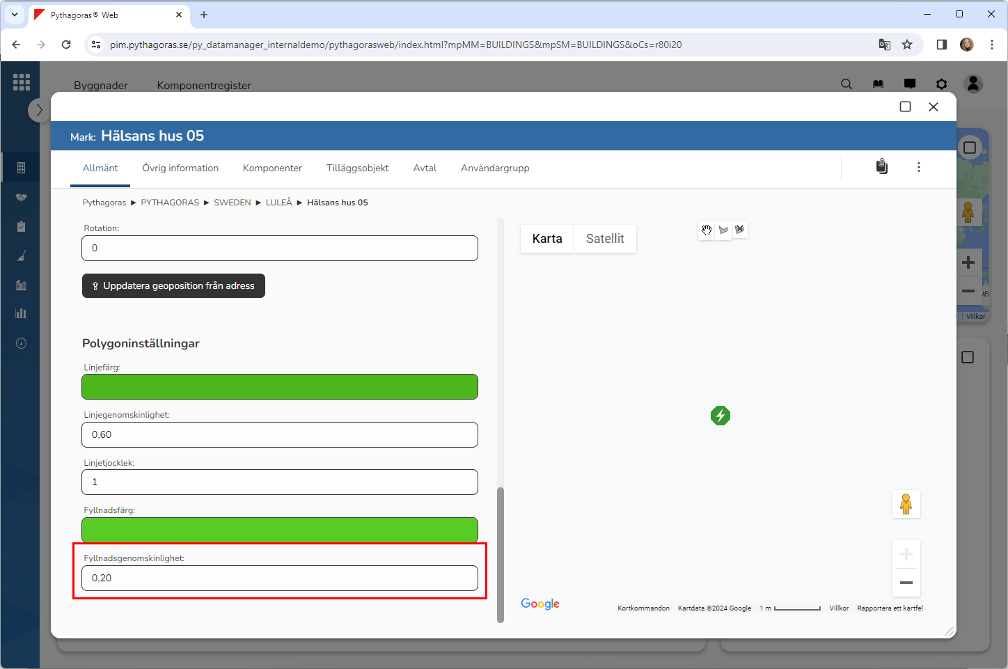Ange hur genomskinlig fyllnaden på den polygon du ska rita in på kartan ska vara (se bilden nedan). Detta genom att ange en fyllnadsgenomskinlighet i fältet med namnet "Fyllnadsgenomskinlighet". Ju lägre fyllnadsgenomskinlighet, desto genomskinligare blir fyllnaden.