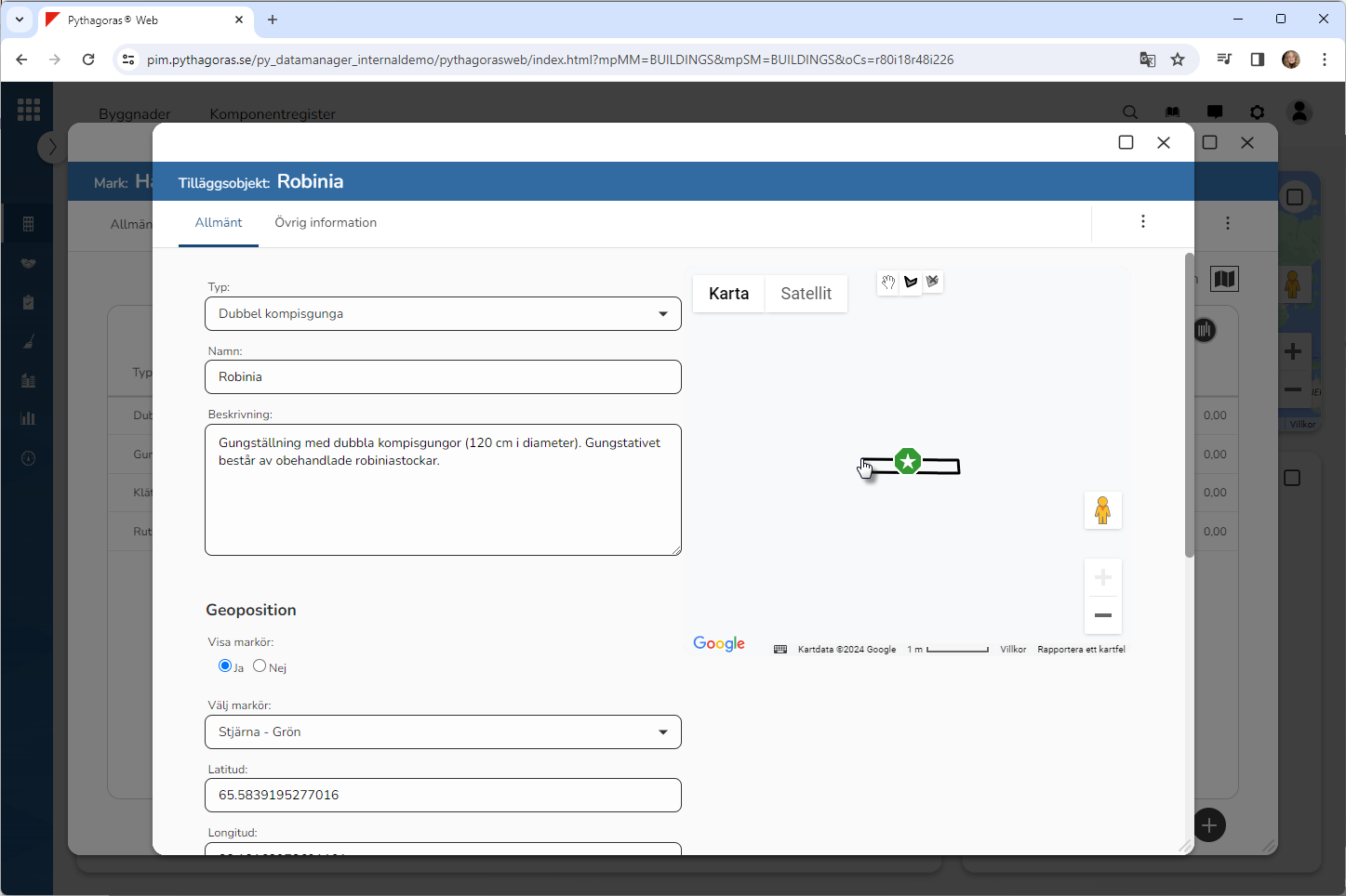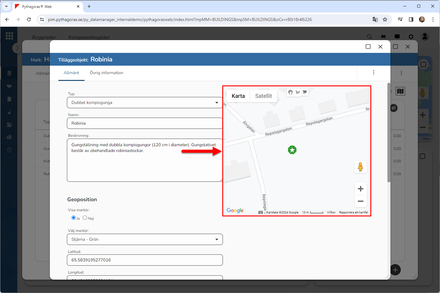 Om det tilläggsobjekt du arbetar med har en kartmarkör som visas på kartan kan du flytta på kartmarkören genom att dra den till en ny plats på kartan. Obs! Om du flyttar på den kartmarkör som är kopplad till ett tilläggsobjekt kommer tilläggsobjektets geoposition att uppdateras.